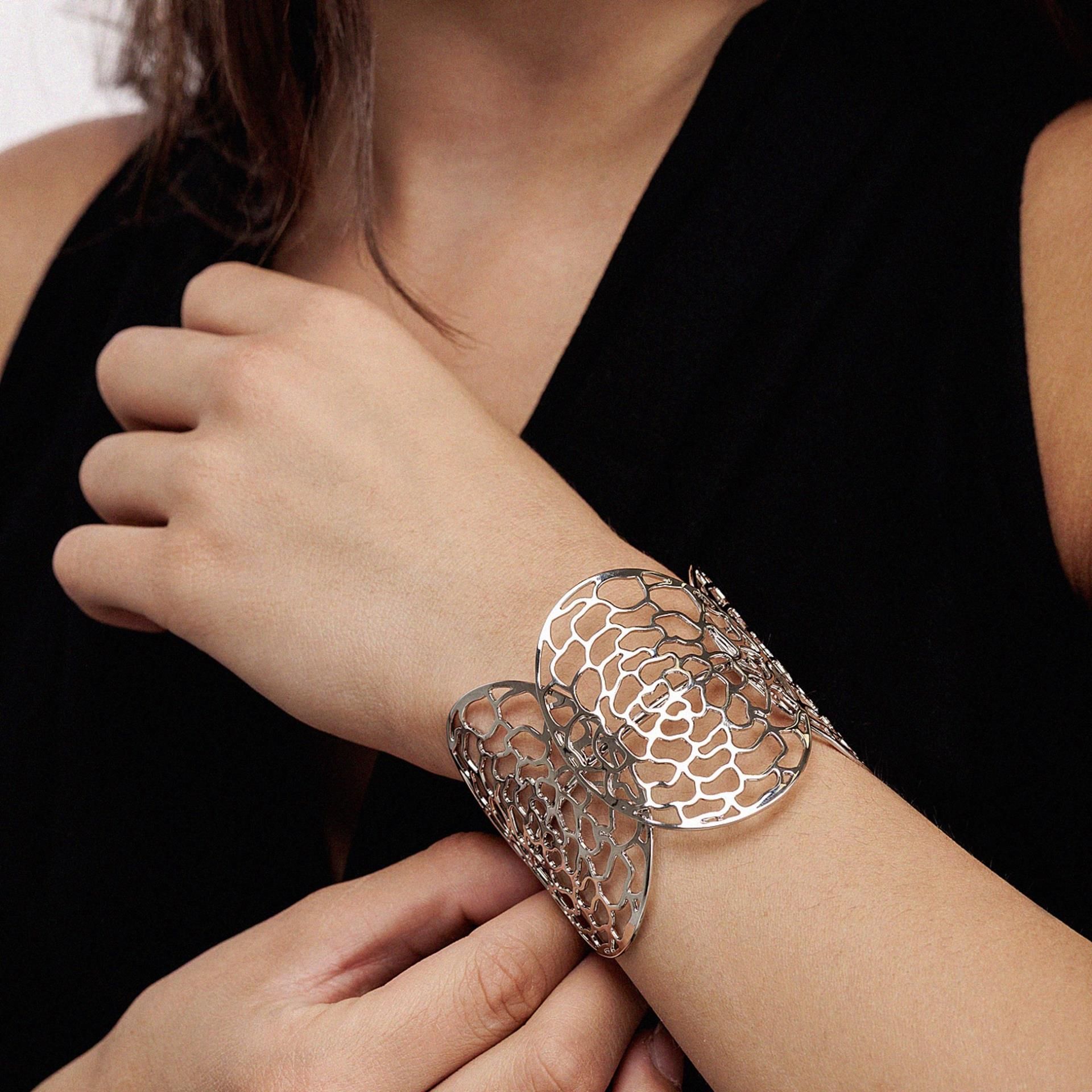 | Highlight: | Allergieverträglichkeit, Handarbeit, anpassbar an Armgröße, aufwendige Verarbeitung, dank Rhodinierung kein Anlaufen wie bei Silberschmuck |
