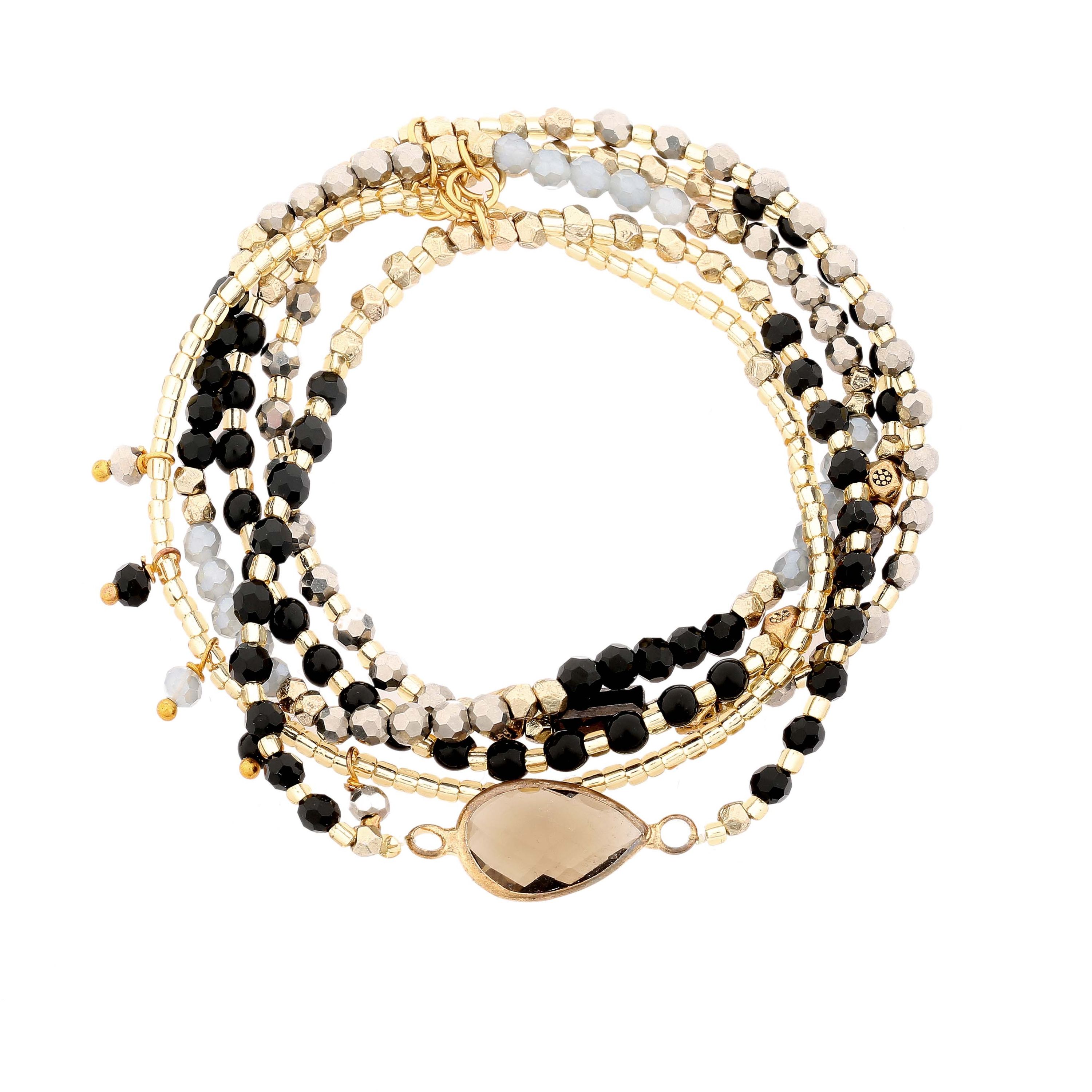 Dieser attraktive Armschmuck aus schwarzen und goldenen Perlen besteht aus 5 zarten Armbändern mit einer Spange praktisch zusammengefasst. Passen tut es übrigens immer: Das Flexband sorgt jederzeit für den richtigen Sitz an Ihrem Handgelenk. Durchmesser ca. 8 cm
