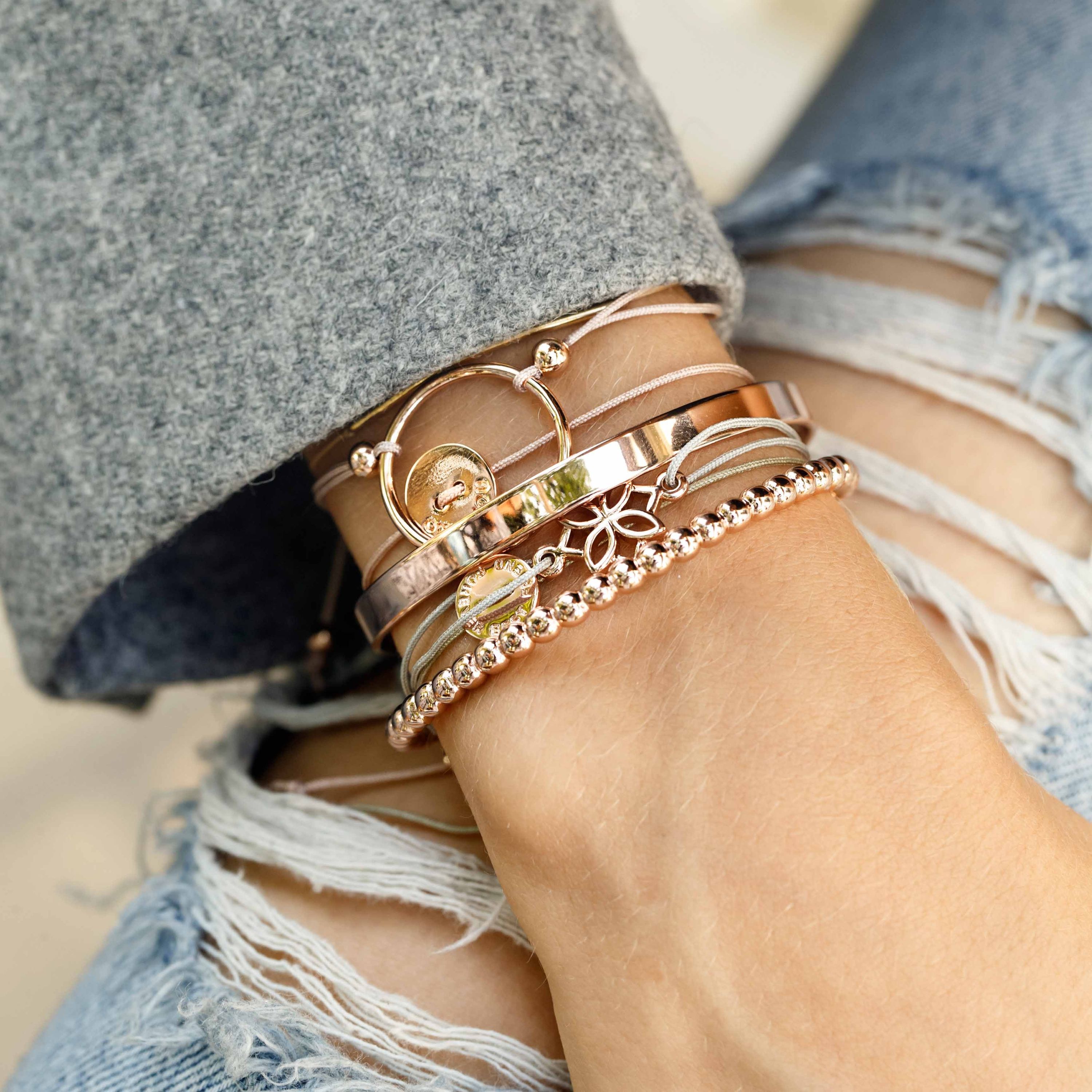 Zartes, beiges Textilarmband mit rosévergoldeten Ornament.