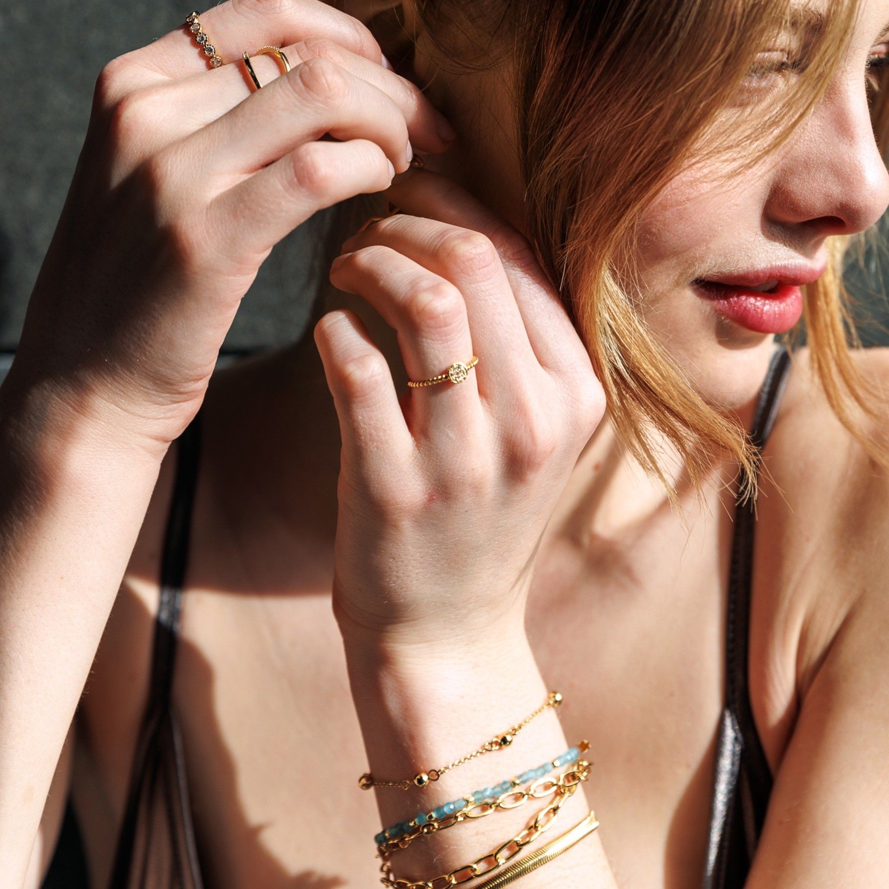 Zarte vergoldete Armkette mit echtem Blue Calci und goldfarbenen Perlen. Ein toller Eyecatcher, der perfekt zu jedem Sommeroutfit passt. Verschiedene Farben, jeweils mit passenden Ohrringen und Halsketten erhältlich. We love! Größenverstellbar