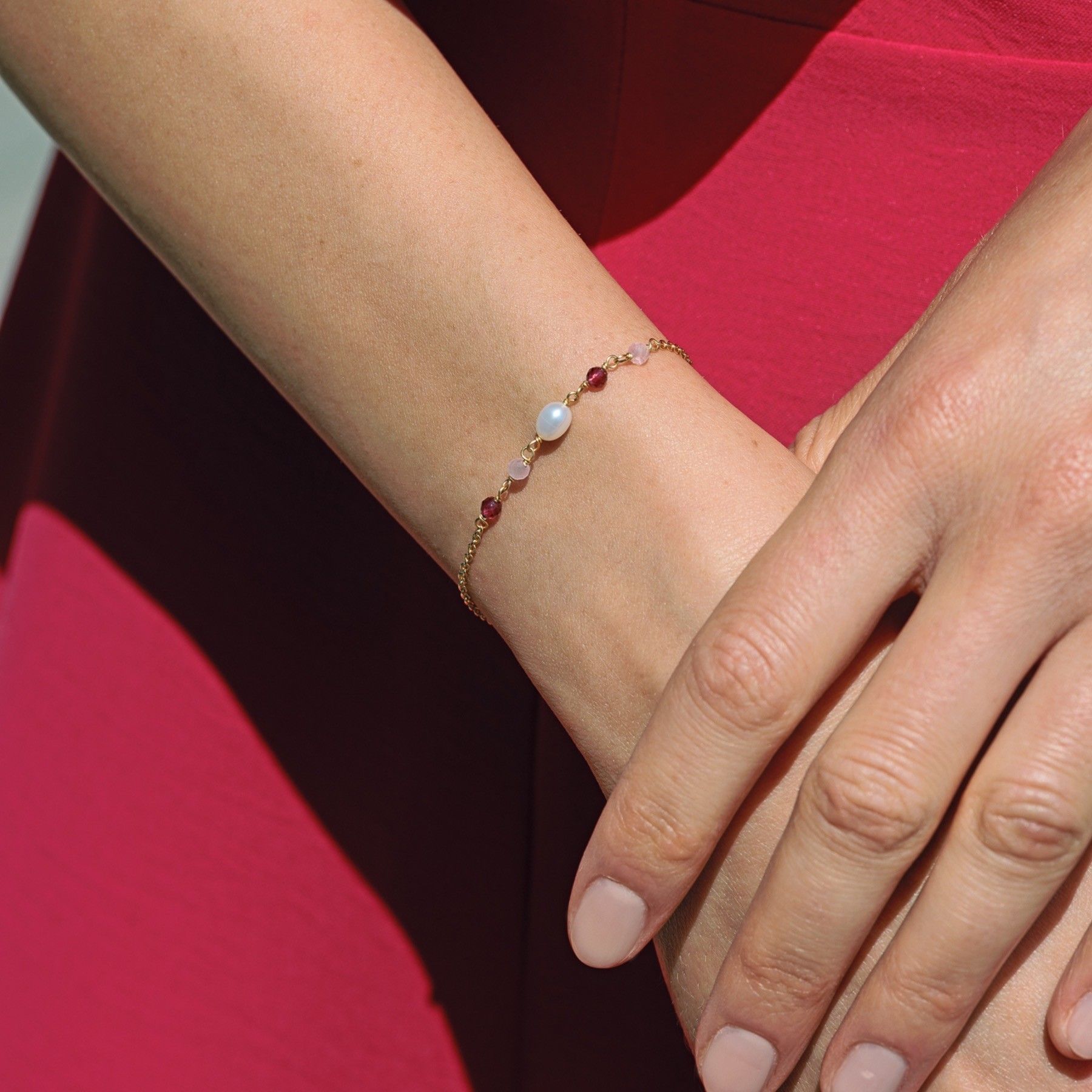 Zarte, vergoldete Armkette mit Perle und Schmucksteinen in pink (Tourmaline Hydro) und echten Edelsteinen in rosa (Onyx). Ein dezentes Highlight, das sich mit vielen Looks kombinieren lässt. Größenverstellbar.