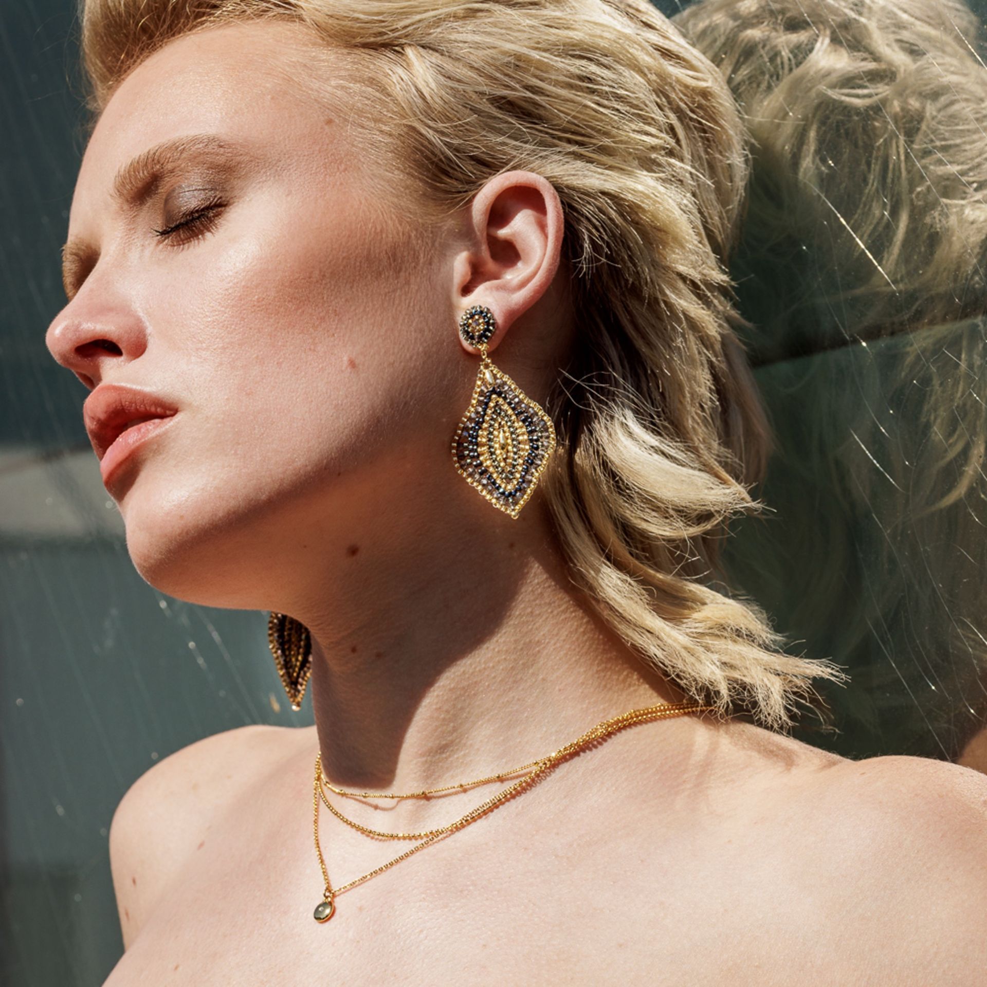 Wunderschöner, handgefertigter Ohrstecker mit fein arrangierten japanischen Seed-Perlen in Grau- und Goldtönen, der in seiner Form an ein Katzenauge erinnert. Das federleichte Design und die angenehme Länge von ca. 6,5 cm sorgen für ein komfortables Tragegefühl.