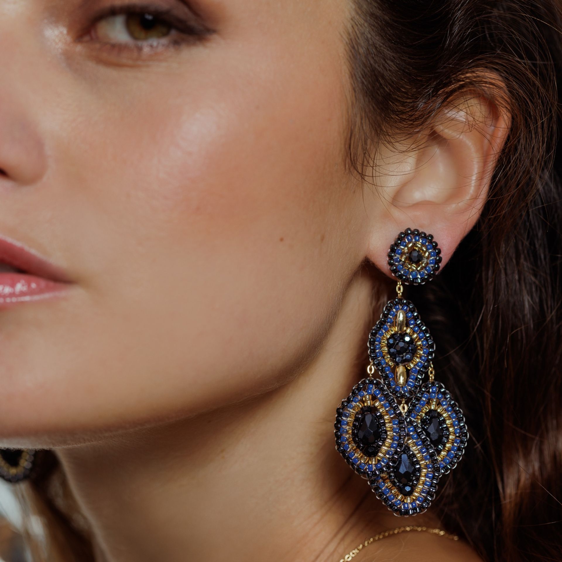 Attraktiver handgefertigter Ohrring in Blau/Grautönen mit 3 beweglichen Anhängern. Der Ohrstecker ist aus Titan gefertigt und somit höchst Allergiker-freundlich. Gesamtlänge des Ohrrings ca. 8cm