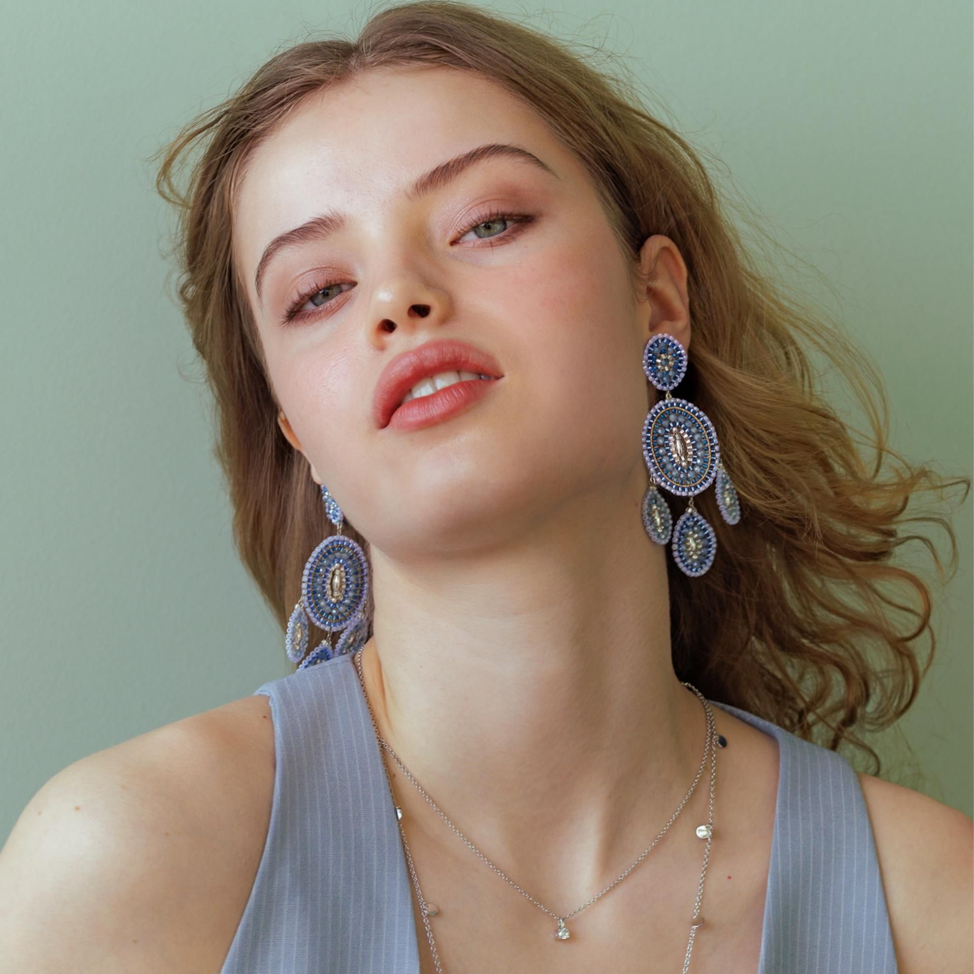 Attraktiver, handgefertigter Ohrring in hellen Blautönen mit 3 beweglichen Anhängern. Ein frischer Eyecatcher mit hohem Tragekomfort, der sich mit vielen Outfits kombinieren lässt. Der Ohrstecker ist aus Titan gefertigt und somit höchst allergikerfreundlich. Gesamtlänge des Ohrrings ca. 9 cm.