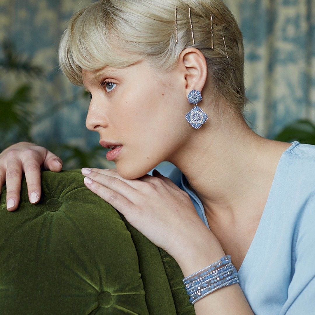 Diese wunderschönen handgefertigten Ohrstecker mit hellblauen/grauen japanischen Seed Perlen ziehen alle Blicke auf sich. Gesamtlänge 5cm