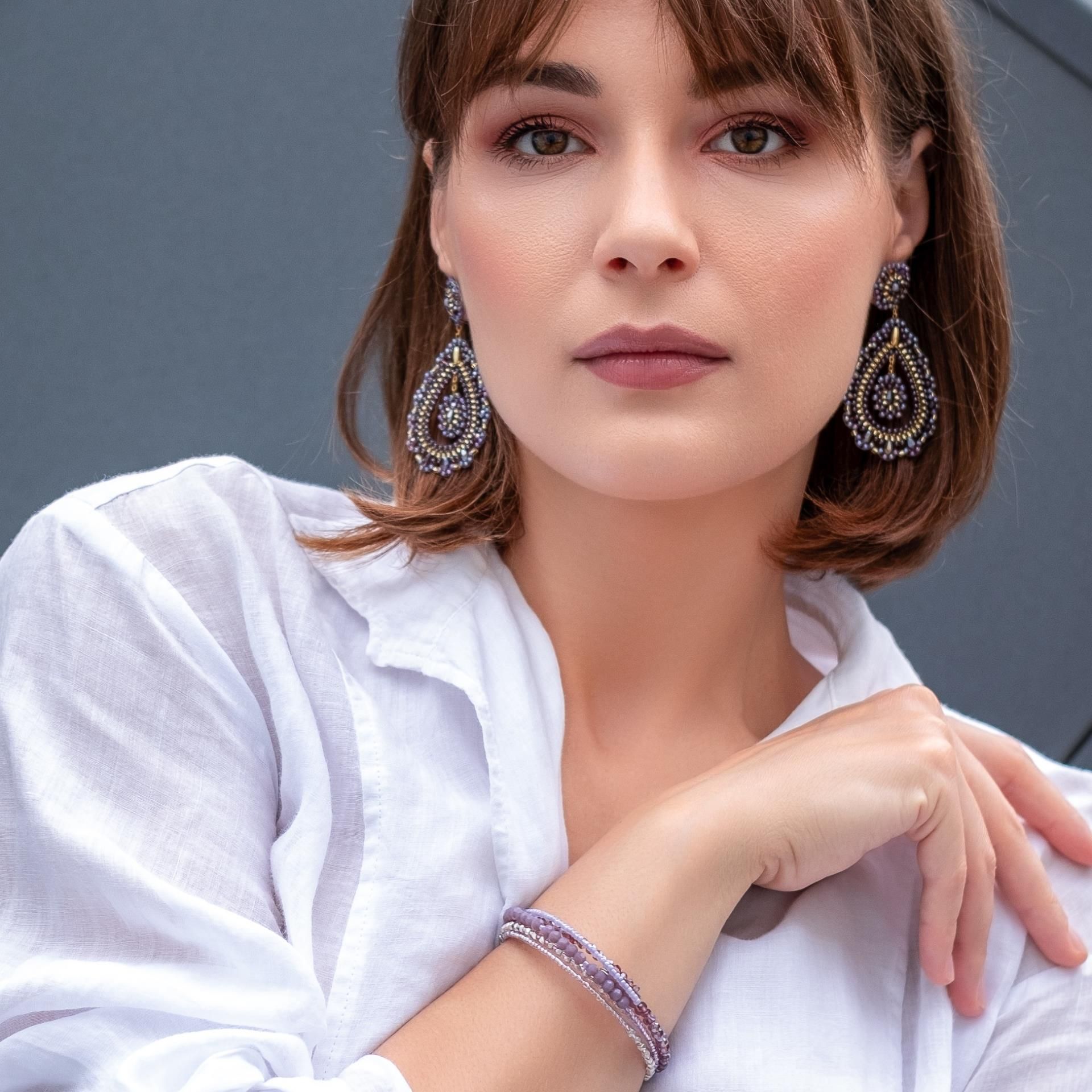 Handgeknüpfte Boho Ohrringe aus edlen Lila- und Gold-farbigen Seed Perlen in Tropfenform. In der Mitte des Tropfens befindet sich ein bewegliches Element, das dem Ohrring eine besondere Raffinesse verleiht. Super leichter Tragekomfort, Stecker aus allergieverträglichem Titan. Gesamtlänge ca. 8cm.