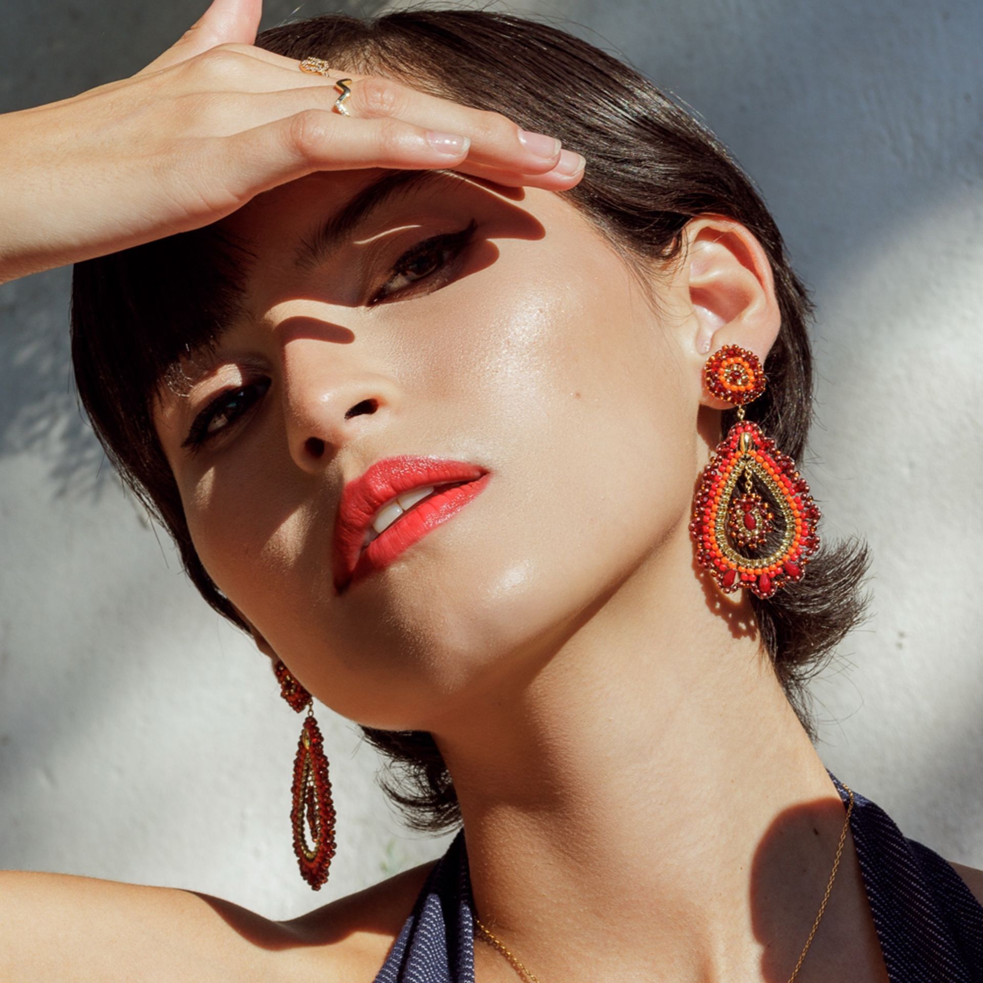 Handgeknüpfte Boho Ohrringe aus edlen Rot/Orange-farbenen Seed Perlen in Tropfenform. In der Mitte des Tropfens befindet sich ein bewegliches Element, das dem Ohrring eine besondere Raffinesse verleiht. Super leichter Tragekomfort, Stecker aus allergieverträglichem Titan. Gesamtlänge ca. 8cm.