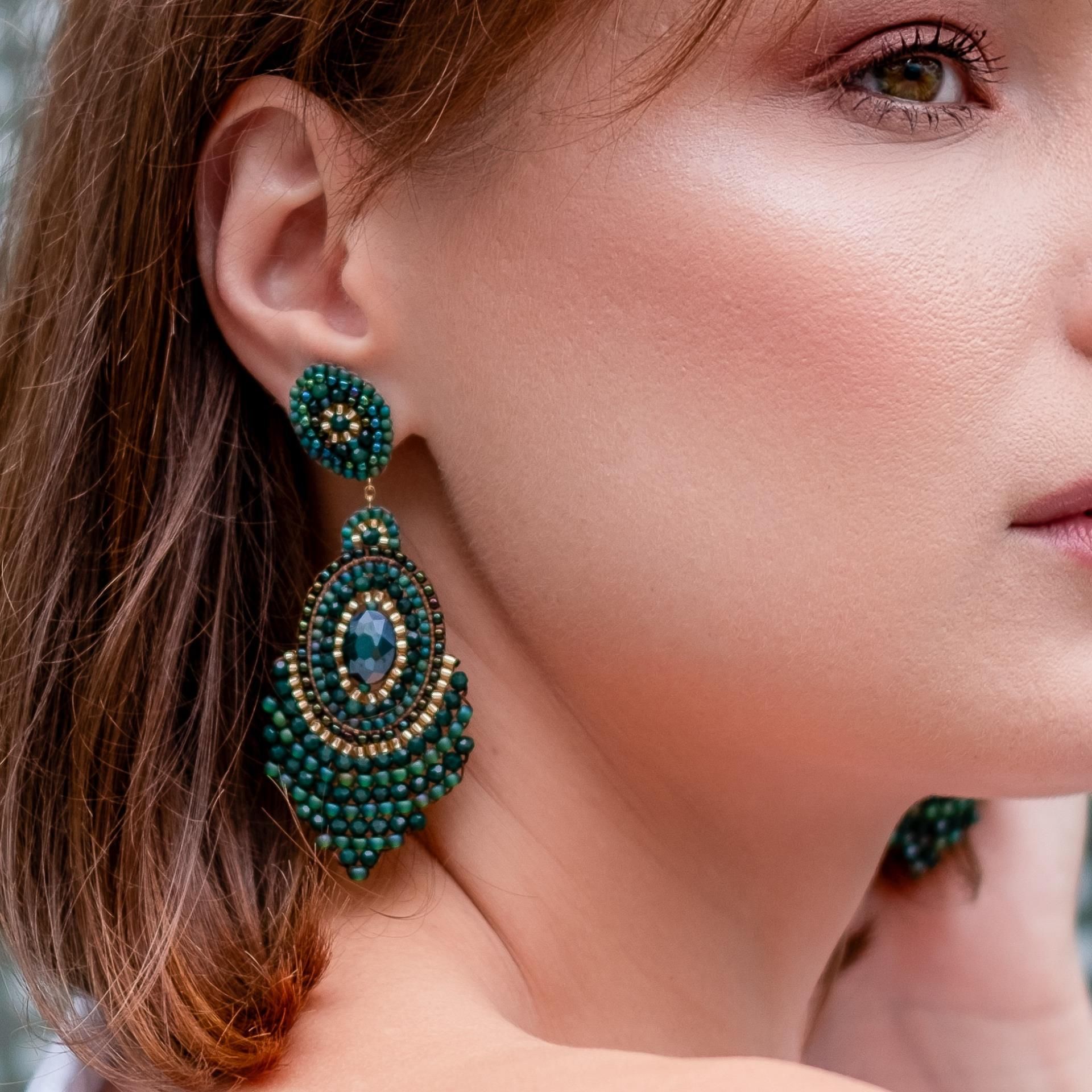 Endlich auch als Clip! Wunderschöner, handgefertigter Boho-Ohrring mit zahlreichen dunkelgrünen japanischen Seed-Perlen. Die extravagante Form macht diesen Ohrring zu einem eleganten Begleiter für besondere Anlässe. Trotz der vielen Perlen hat der Ohrring ein leichtes Gewicht und ist durch den bequemen Clipverschluss und seine Gesamtlänge von ca. 8,8 cm angenehm zu tragen.