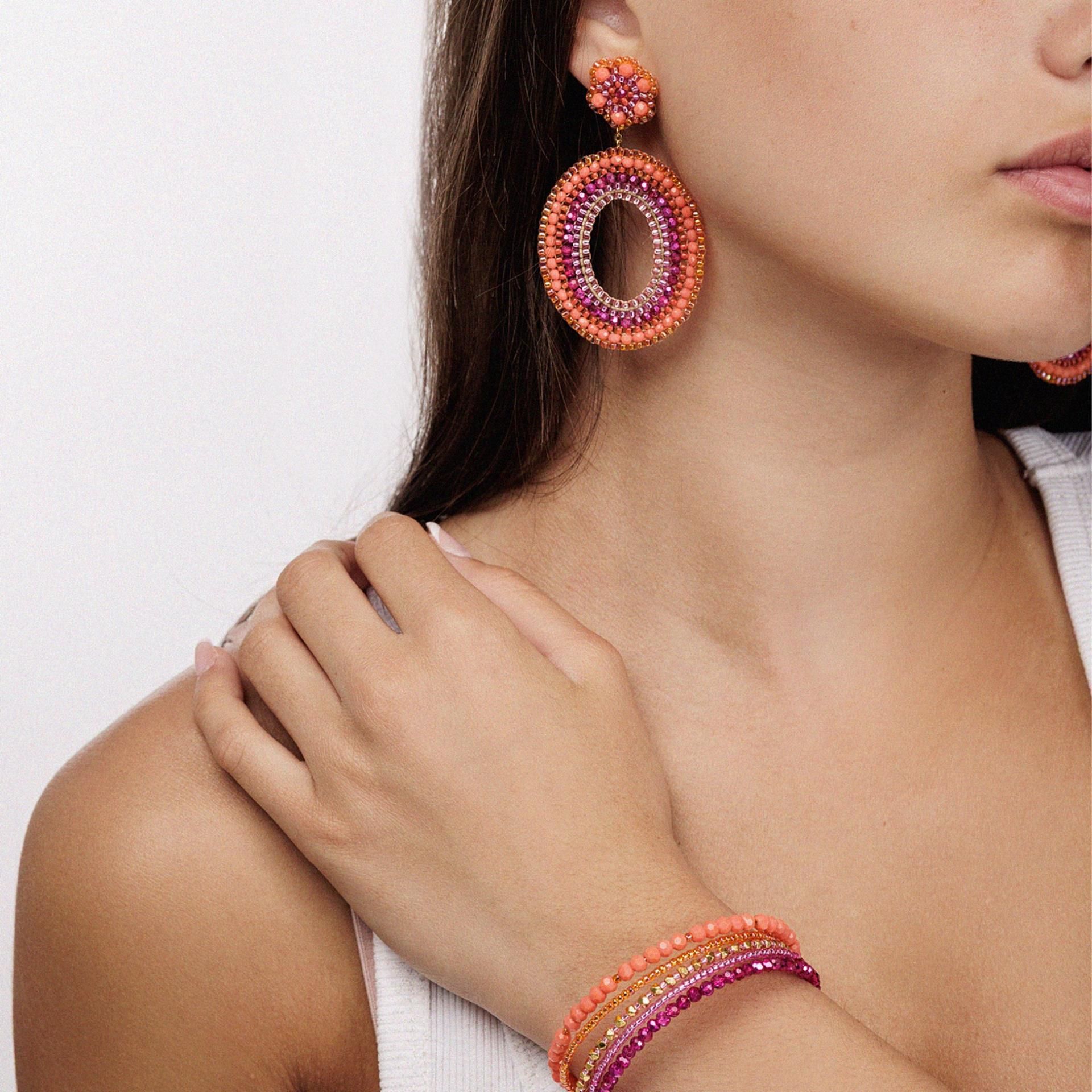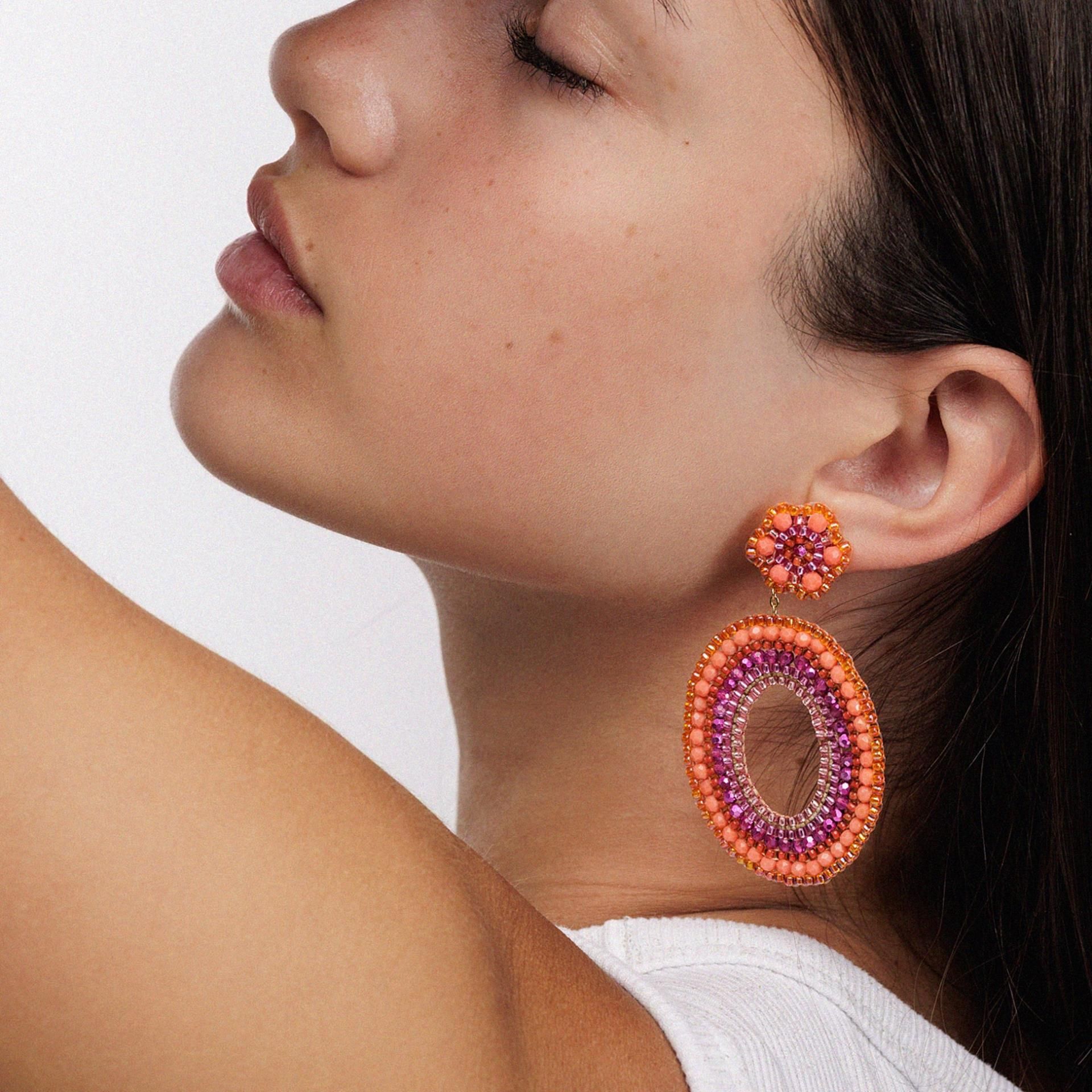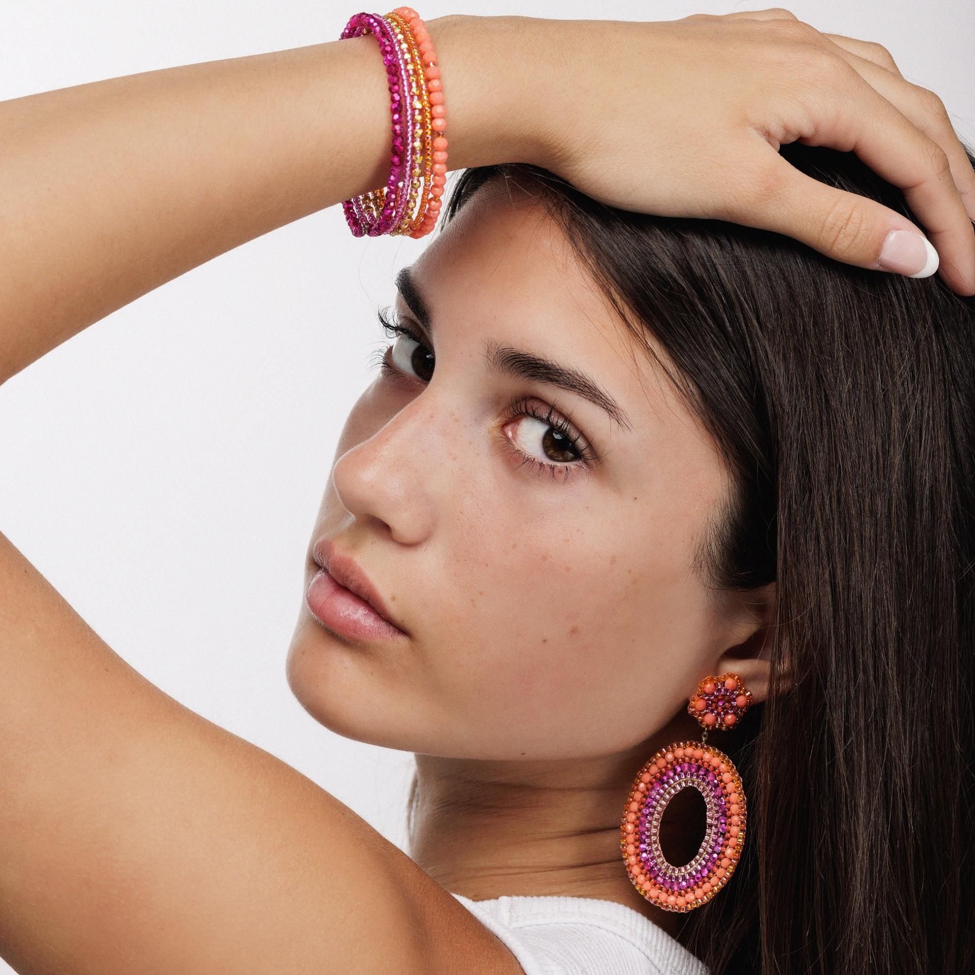 Endlich auch als CLIP! Die wunderschönen ovalförmigen Boho-Ohrringe aus korall- und pinkfarbigen Seed Perlen sind ein besonderer Eyecatcher. Hoher Tragekomfort dank leichtem Gewicht und angenehmem Clip-Verschluss. Passender Drahtarmreifen erhältlich! Gesamtlänge ca. 7,5 cm.