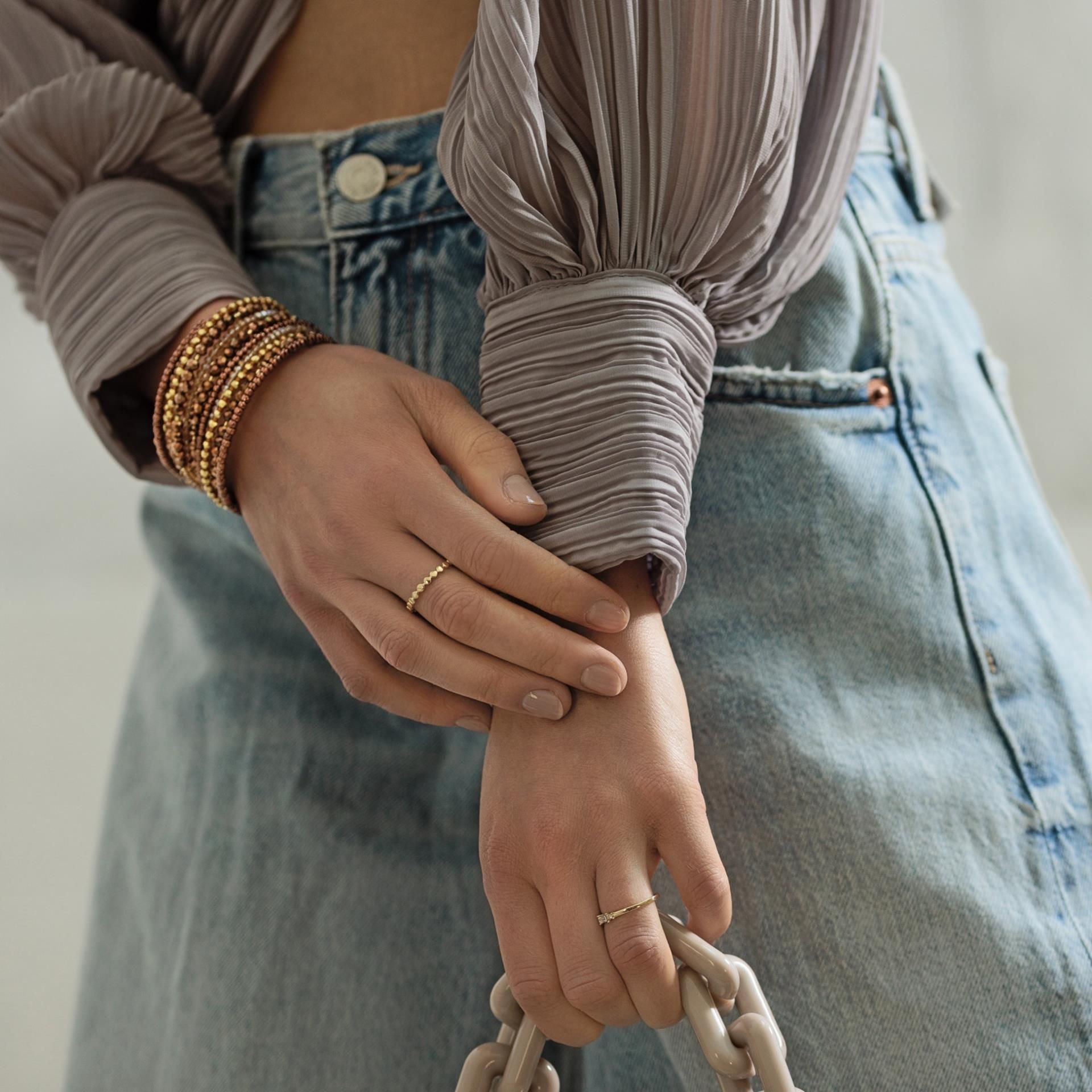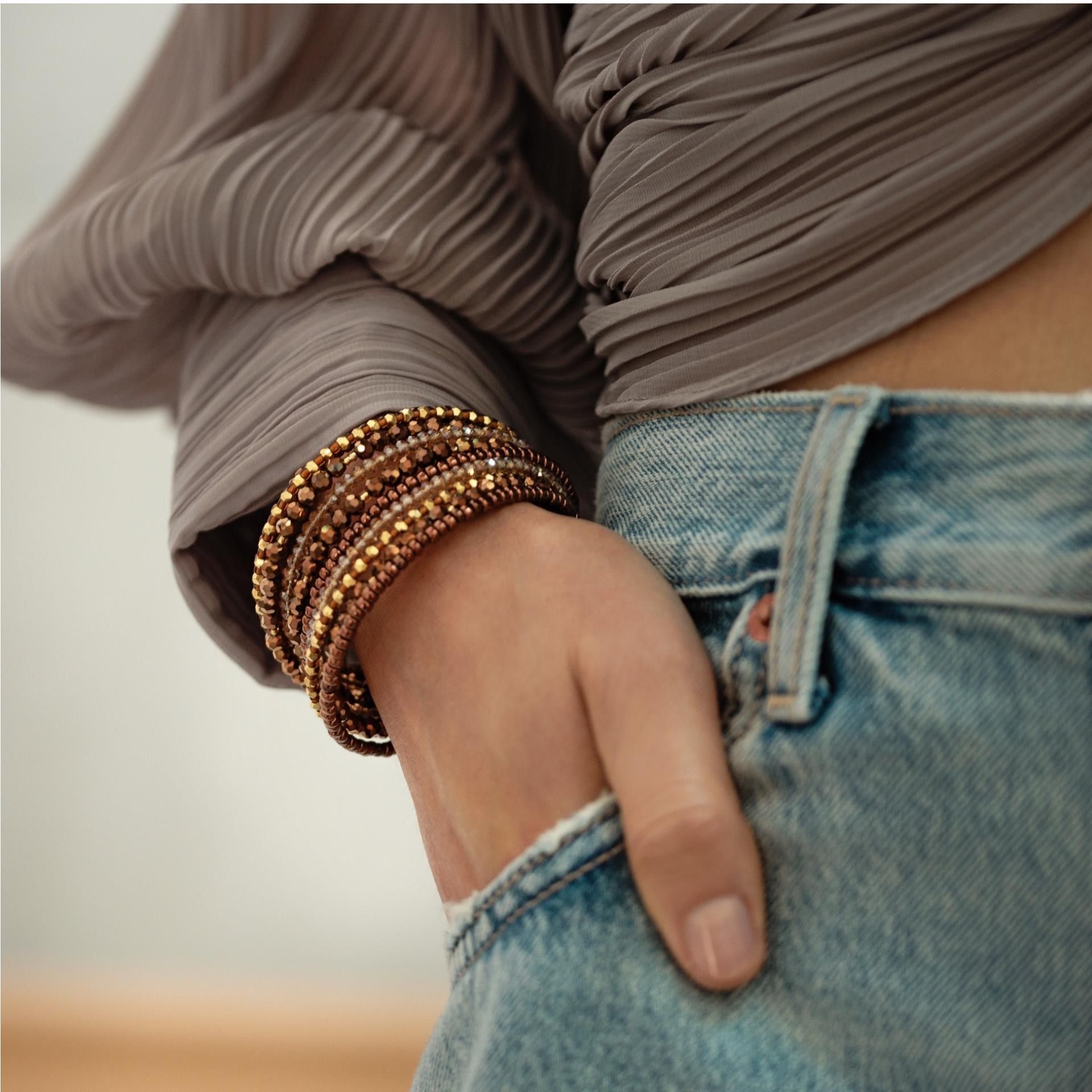 Dieser wunderschöne Drahtarmreifen wurde mit viel Liebe zum Detail gearbeitet. Die unzähligen braunen Beads geben dem Armreifen ein leuchtendes Finish und bringen seine Trägerin zum Strahlen. Durch sein besonderes und trendiges Design ist der Armschmuck ein Must-have für alle, die Design und Fashion lieben.