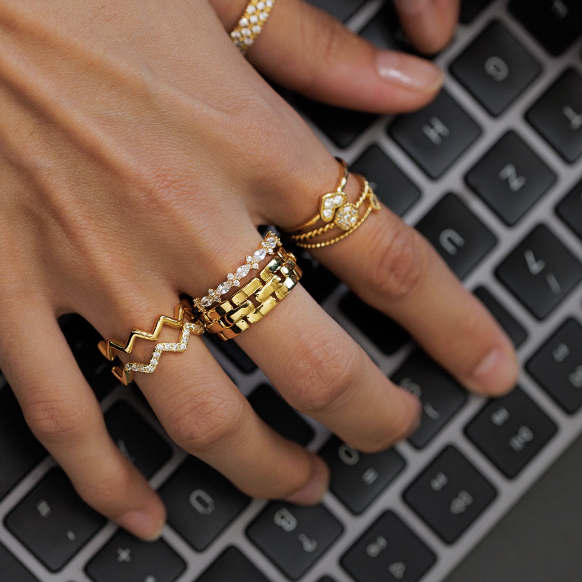 Dieser vergoldete Ring im Kettenglieder-Look kombiniert moderne Eleganz mit auffälligem Design. Die ineinander verschlungenen Glieder verleihen dem Ring eine markante Struktur und machen ihn zu einem echten Hingucker. Passender Armschmuck erhältlich!