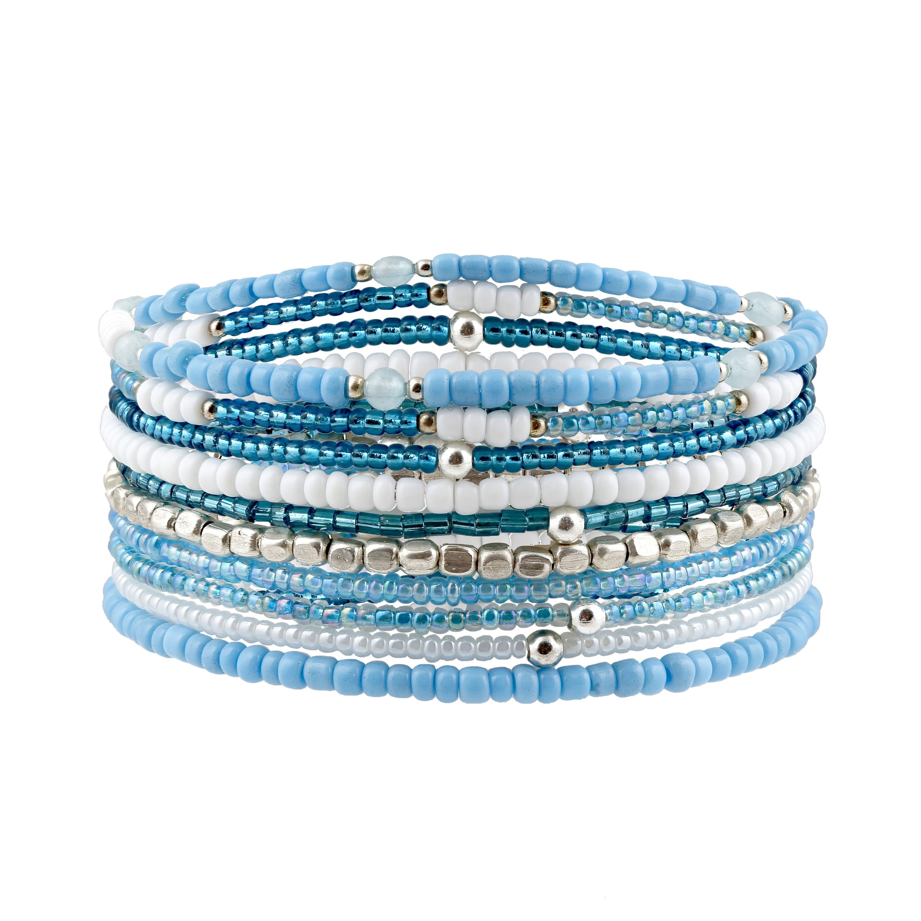 Dieser attraktive Armschmuck aus weißen und blauen Perlen besteht aus 10 zarten Armbändern. Passen tut es übrigens immer: Das Flexband sorgt jederzeit für den richtigen Sitz an Ihrem Handgelenk.