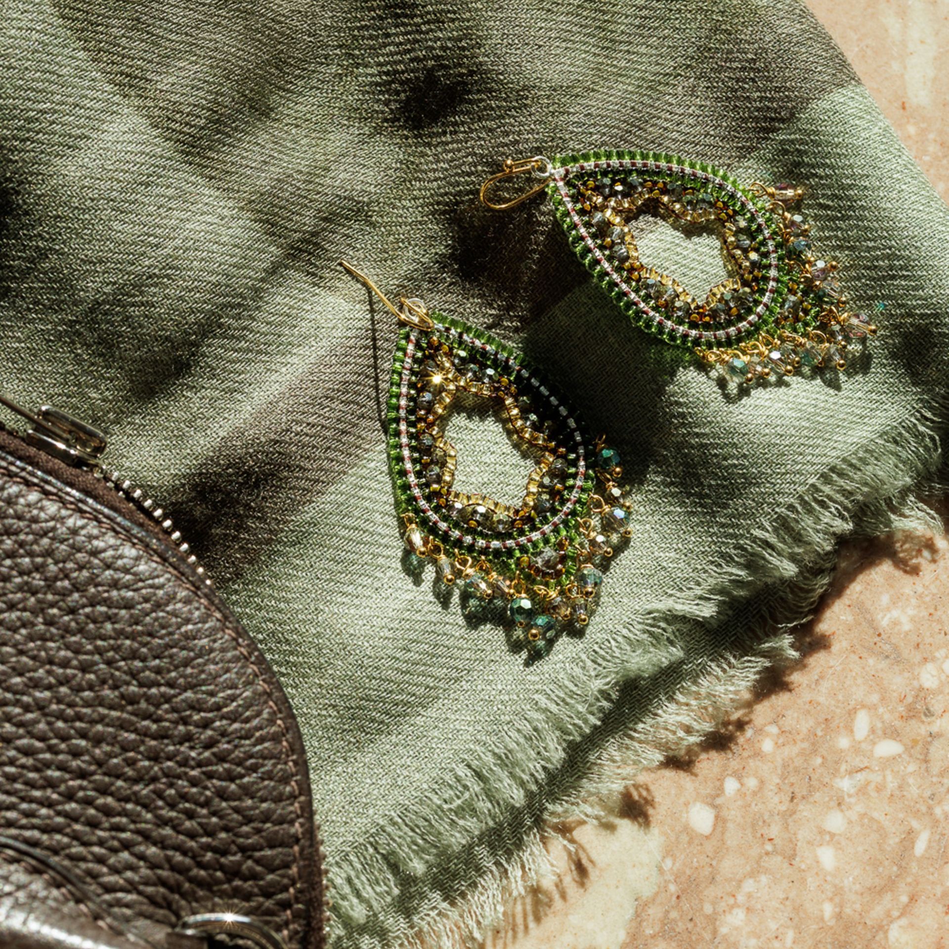 Leichter Sommerschal aus 100% Merinowolle in angesagten Grüntönen mit coolem Print-Muster. Der Schal schmiegt sich angenehm an den Hals und wird vor allem in Kombination mit den passenden Ohrringen zu einem echten Blickfang!