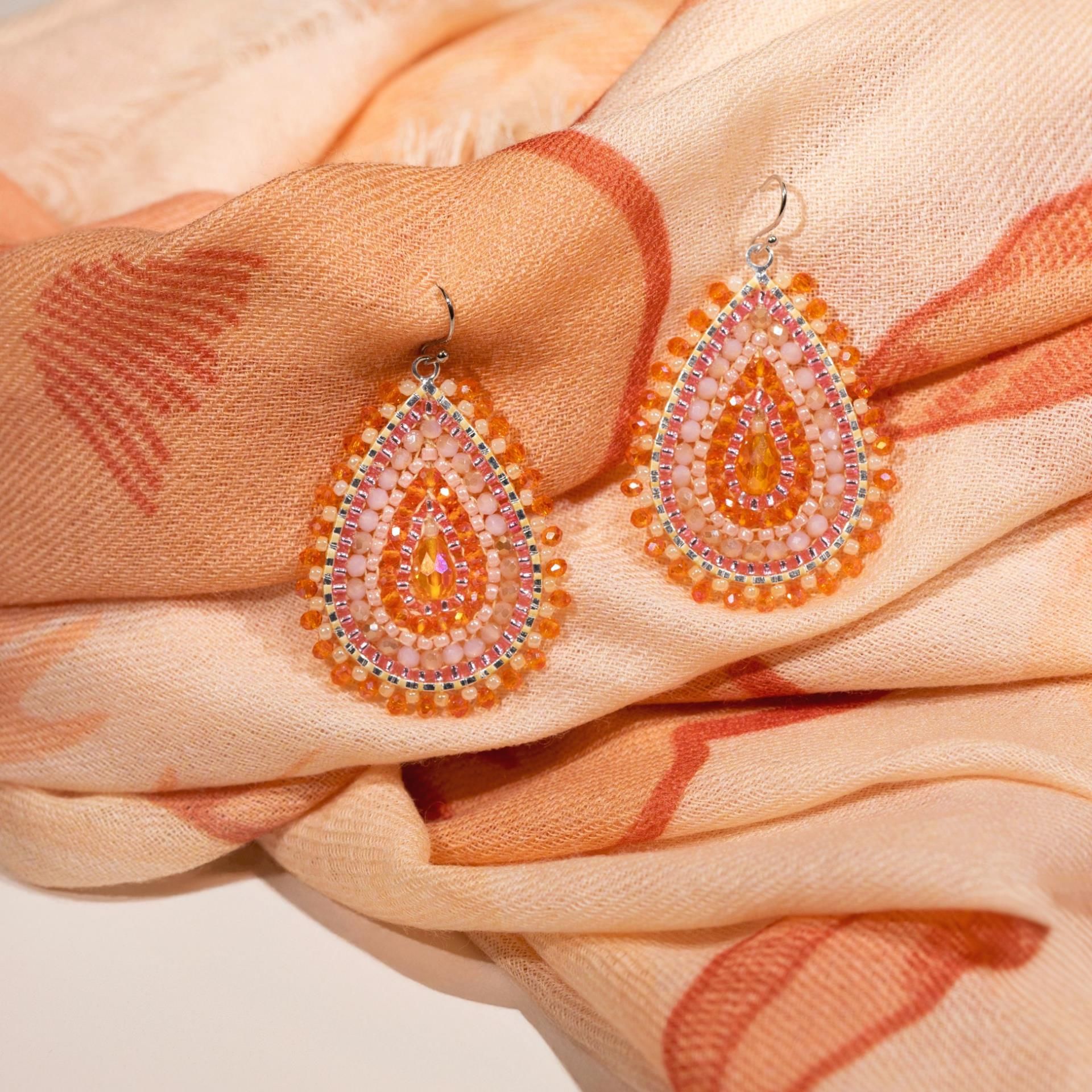 Leichter Sommerschal aus 100% Merinowolle in sanften Koralltönen mit coolem Print-Muster. Der Schal schmiegt sich angenehm an den Hals und wird vor allem in Kombination mit den passenden Ohrringen zu einem echten Blickfang!