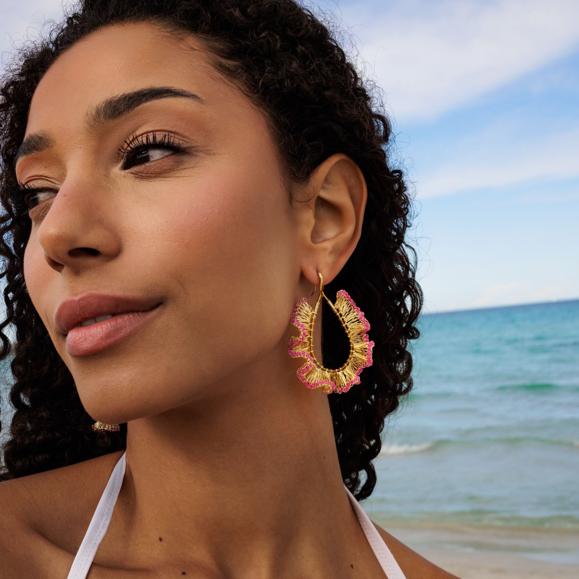 Einzigartiger, korallenförmiger Ohrhänger aus vergoldetem Draht und einer Reihe aus pinken, japanischen Seed Perlen. Ein besonderer Eyecatcher als Ergänzung zu vielen Outfits. Super leichter Tragekomfort, Gesamtlänge ca. 5,5 cm.