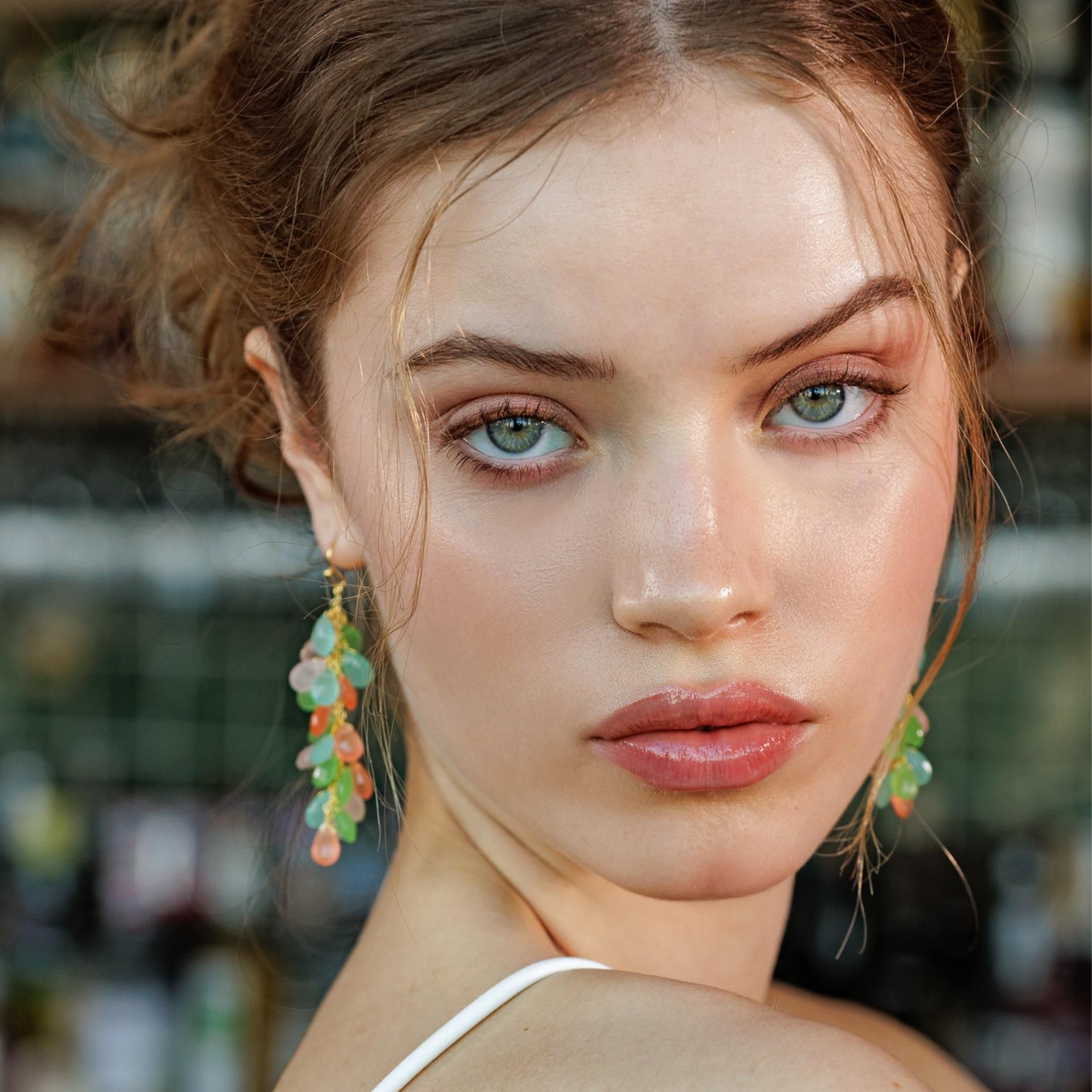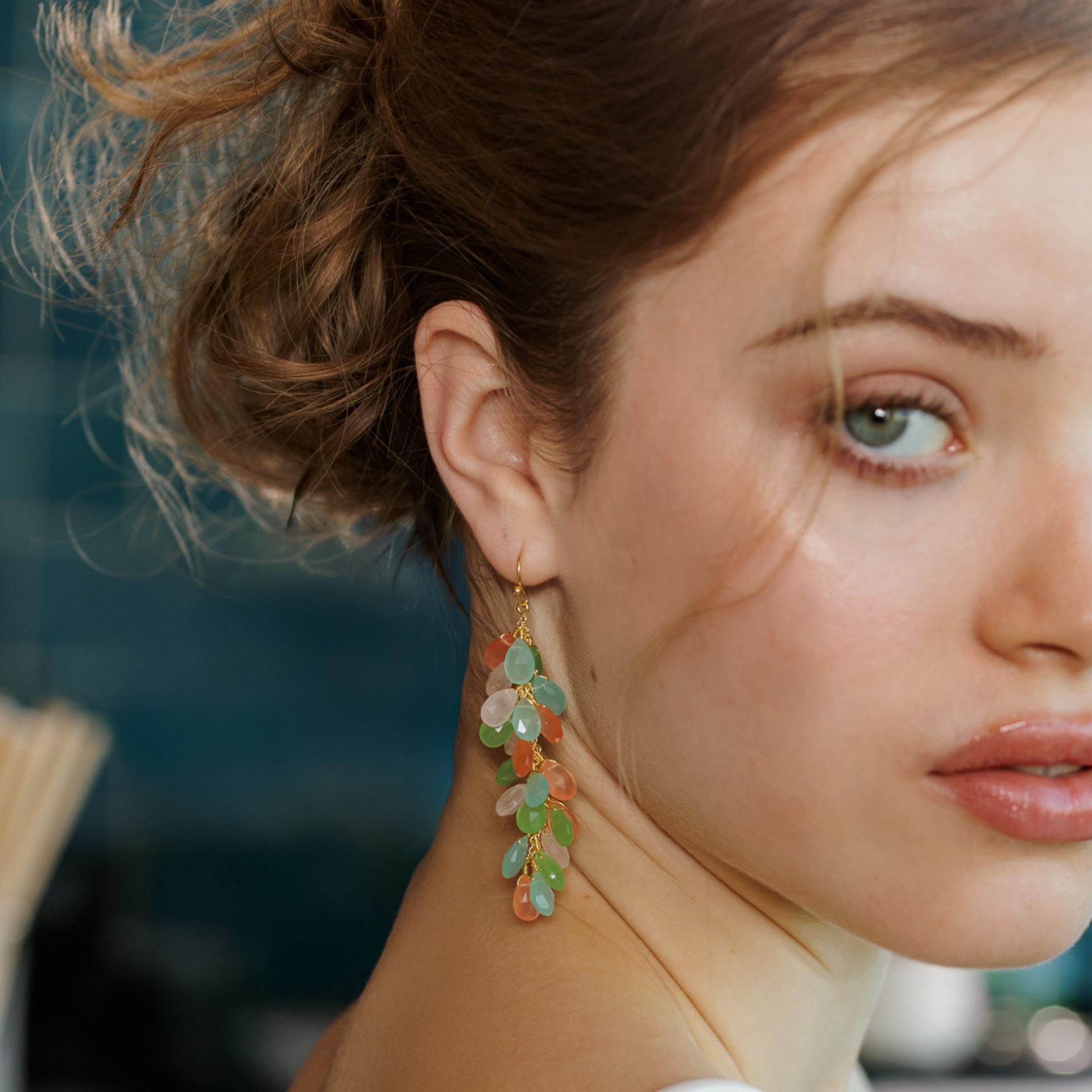 Verspielte Ohrringe in sommerlichen Farben, die jedes Outfit auffrischen. Zahlreiche echte, geschliffene Edelsteine (Prehnite, Aqua Hydro, Light Orange Jade und Pink/Rose Jade) machen diese Ohrringe zu etwas ganz Besonderem.