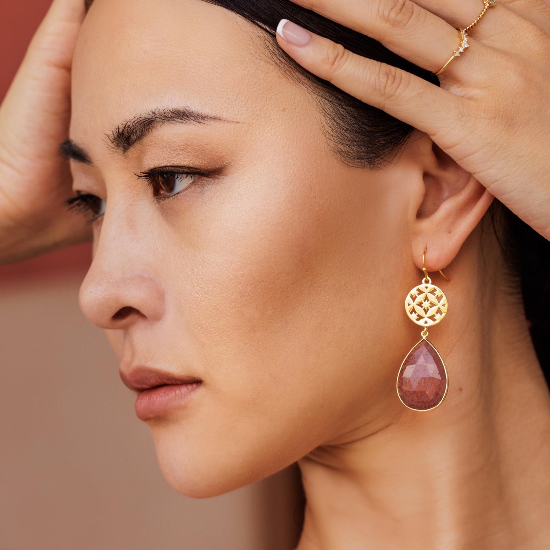 Wunderschöne vergoldete Ohrhänger mit einem Ornament und echtem Edelstein (Erdbeerquarz). Die eleganten Ohrringe sind ein dezenter Blickfang und lassen sich optimal zu jedem Gold oder Rosé-Ton kombinieren. Gesamtlänge ca. 5,5cm.