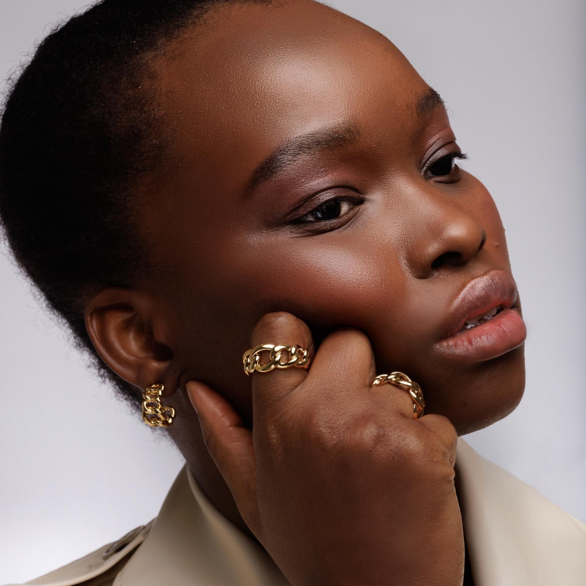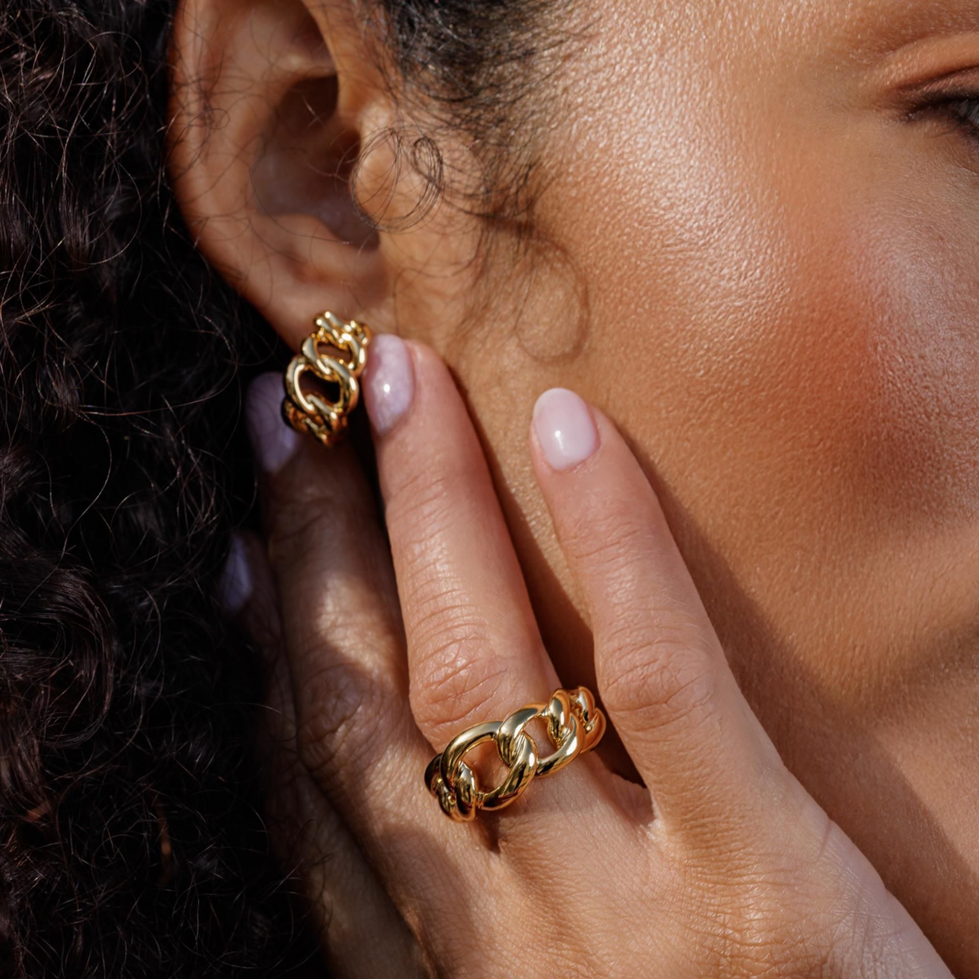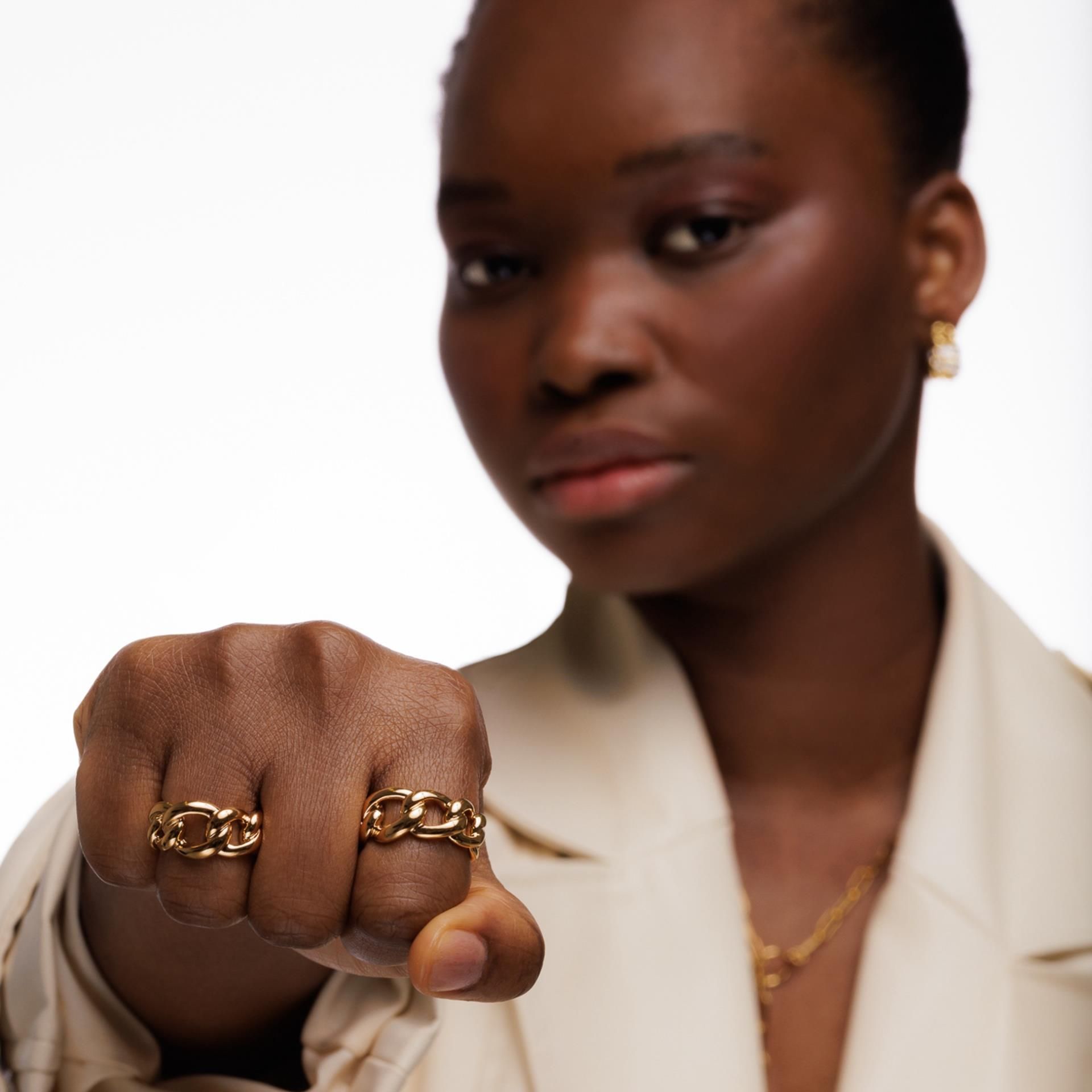 Dieser vergoldete Ring im Kettenglieder-Look kombiniert moderne Eleganz mit auffälligem Design. Die ineinander verschlungenen Glieder verleihen dem Ring eine markante Struktur und machen ihn zu einem echten Hingucker. Passende Ohrringe erhältlich!