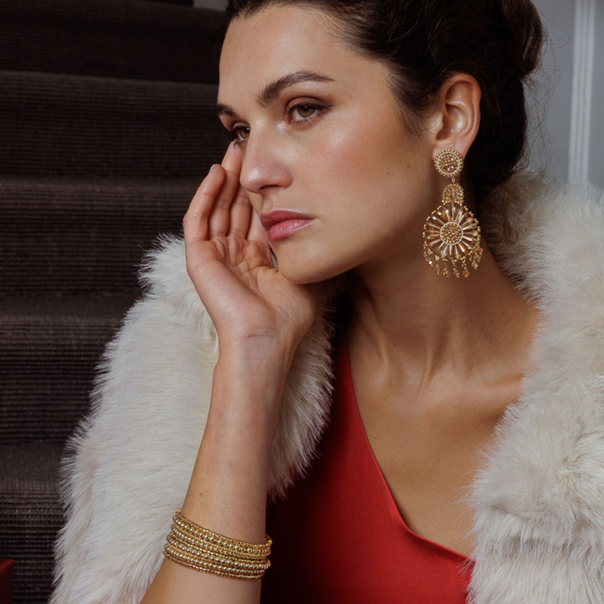 Einzigartige handgefertigte Eyecatcher Ohrringe, die mit ihren golden funkelnden Glasperlen alle Blicke auf sich ziehen. Leichter Tragekomfort, Stecker aus Titan und damit höchste Verträglichkeit, Gesamtlänge ca. 8cm.