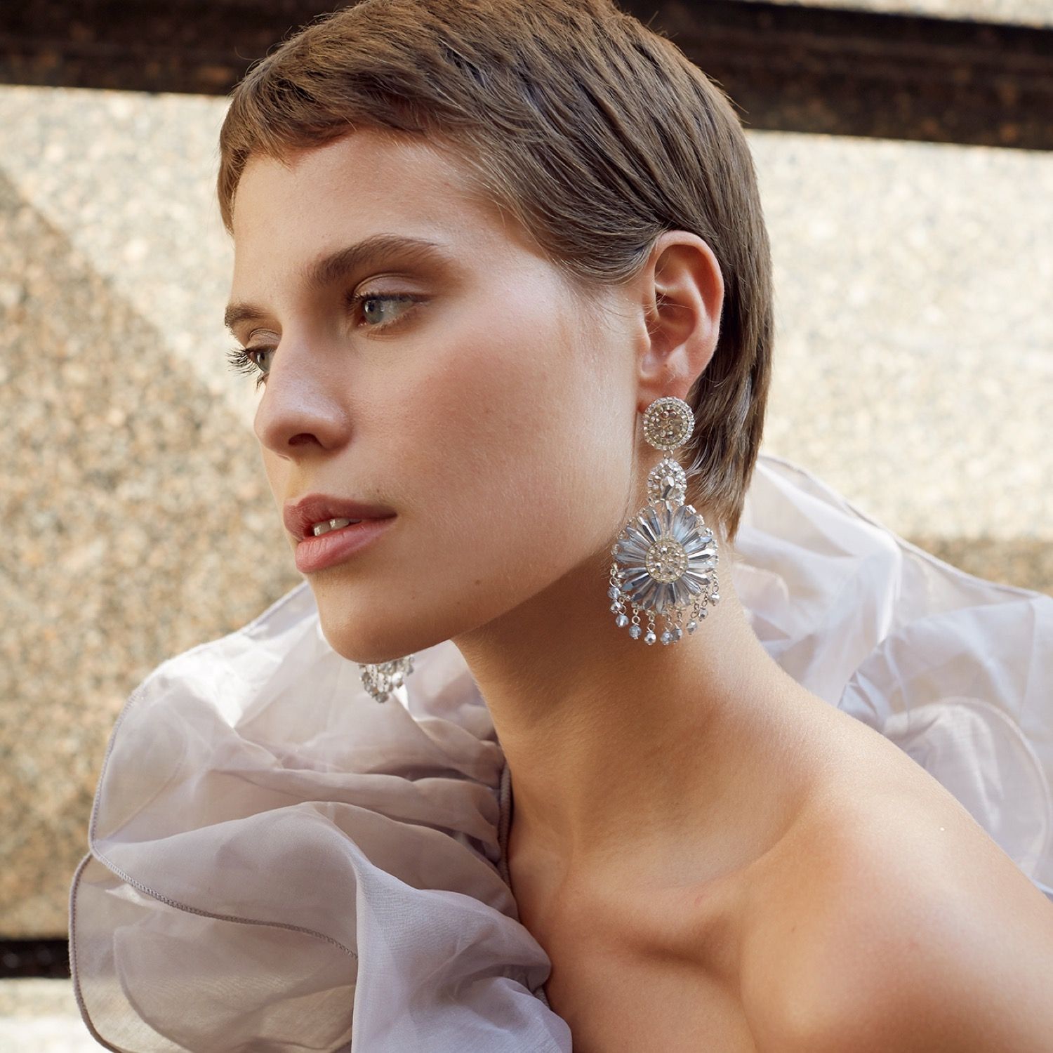 Einzigartige Eyecatcher Ohrringe, die mit ihren silbern funkelnden Steinen alle Blicke auf sich ziehen. Leichter Tragekomfort, Stecker aus Titan und damit höchste Verträglichkeit, Gesamtlänge ca. 8 cm.