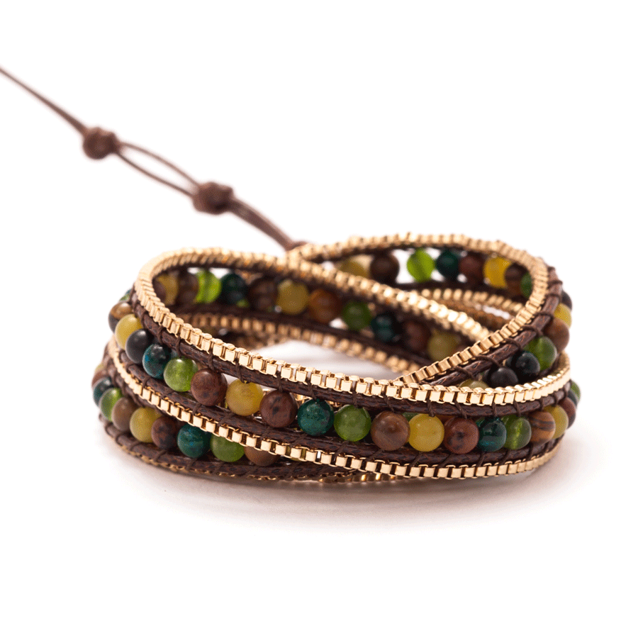 Dieses handgefertigte Wickelarmband aus grünen, braunen und gelben Halbedelsteinen, einem braunen Cord-Band und einer vergoldeten Kette ist ein lässiges Accessoire, das jedes Outfit komplementiert. Es kann perfekt alleine oder in Kombination mit anderen Armbändern getragen werden und ist größenverstellbar. Kette: Messing vergoldet Perlen: Grüner Howlith, Tigerauge, Jaspisperlen, gelber Achat