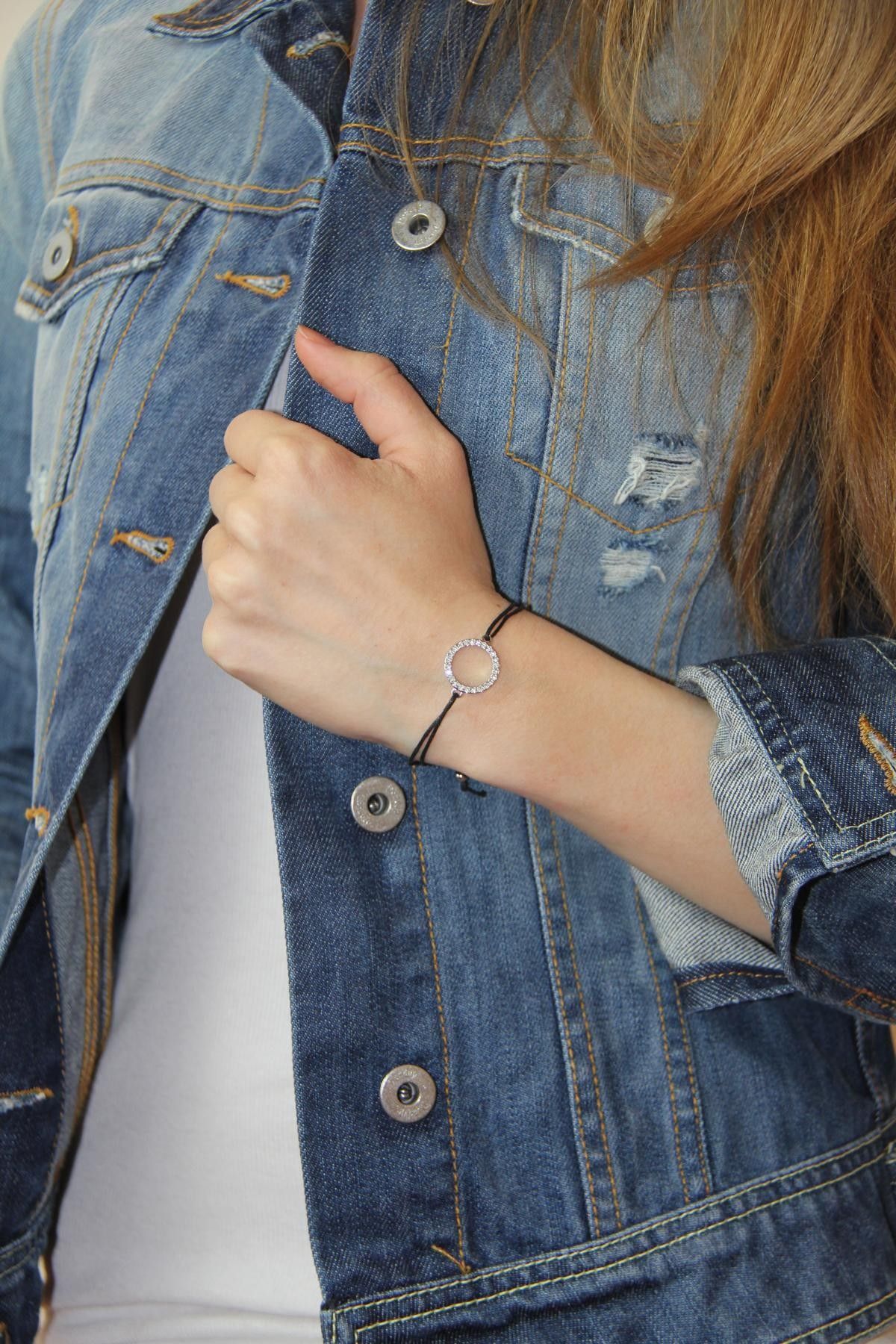 Ultra-thin black textile bracelet with a small rhodium-plated ring set with crystals. Adjustable bracelet length. Diameter of the ring approx. 1.4 cm.