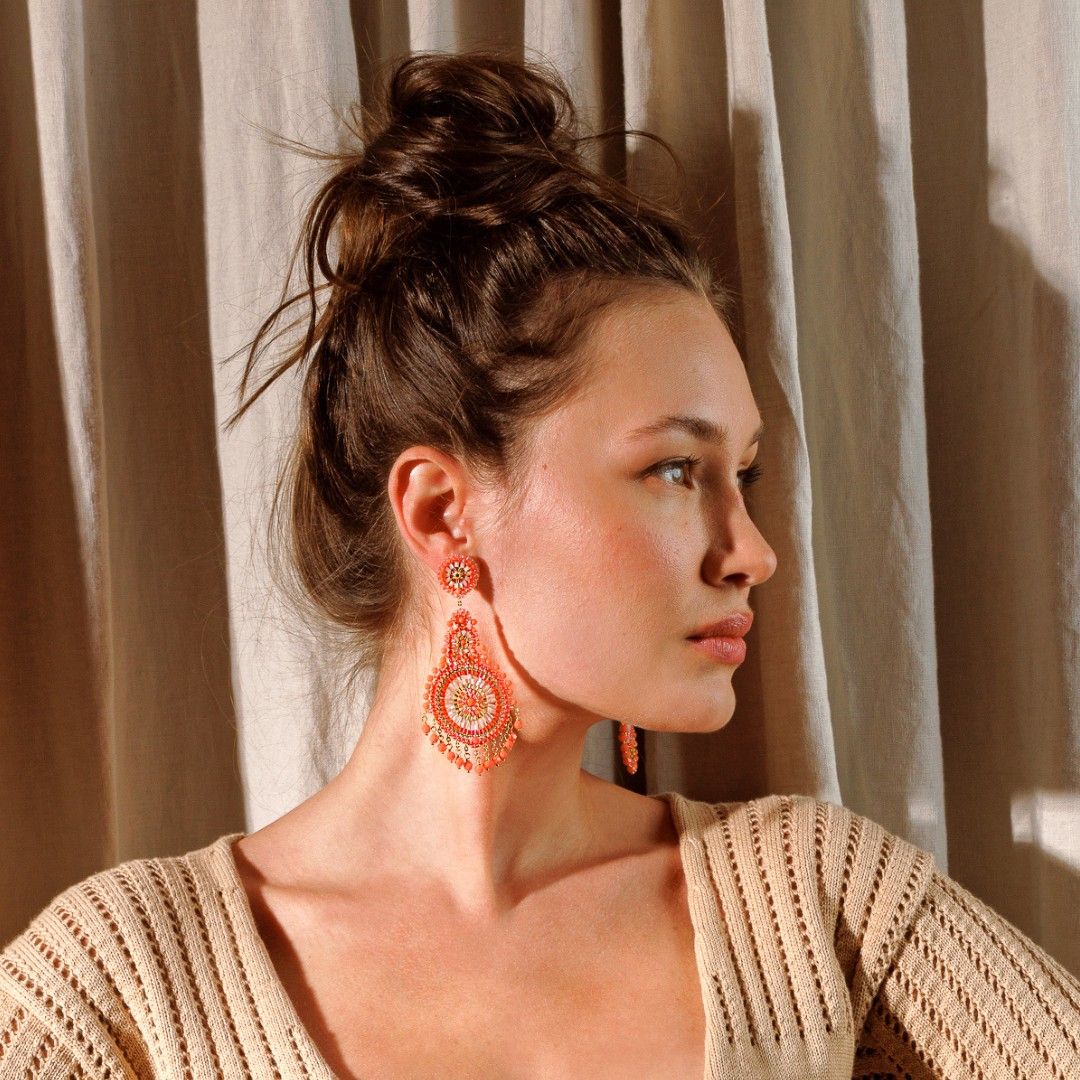New in! Spectacular hand-knotted earrings in shimmering coral colours. Despite their size of approx. 9.5 cm, they are lightweight and very comfortable to wear thanks to the allergy-friendly titanium studs! Our must-have of the current season!