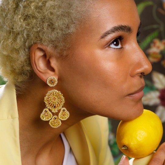 Handmade earrings made from yellow seed beads with a total length of approx. 7 cm. The 3 movable elements give the earrings a playful character and enhance any look. The subtle colour combination goes with any colour, making it an indispensable companion. The titanium ear studs guarantee maximum compatibility