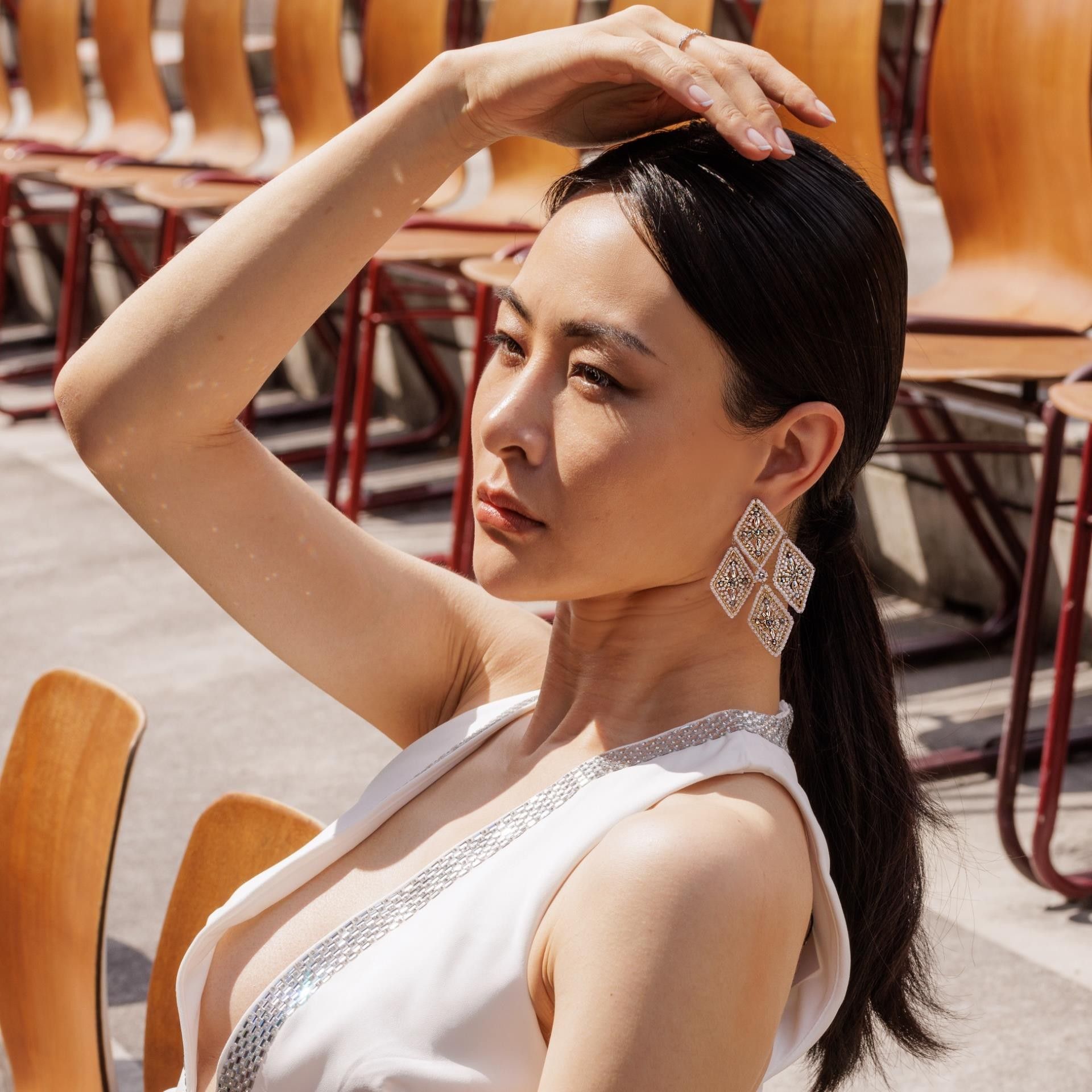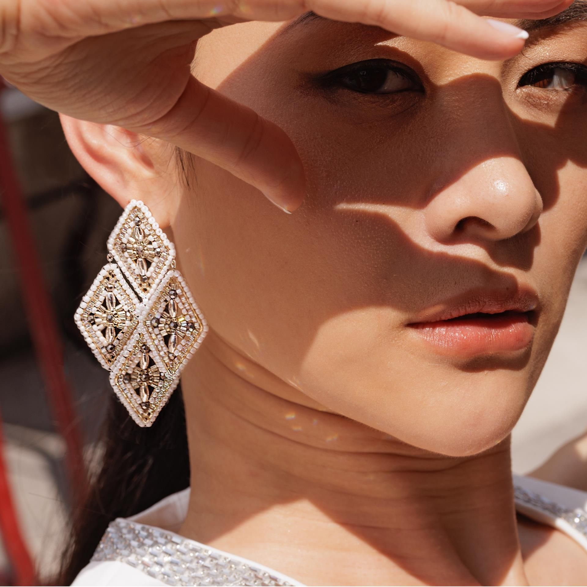 These beautiful stud earrings with four white diamonds made from Japanese seed pearls are a special eye-catcher. The ear studs are made of titanium and are therefore extremely allergy-friendly. The super light wearing comfort makes these handmade earrings one of our absolute favourites! Total length approx. 8 cm.