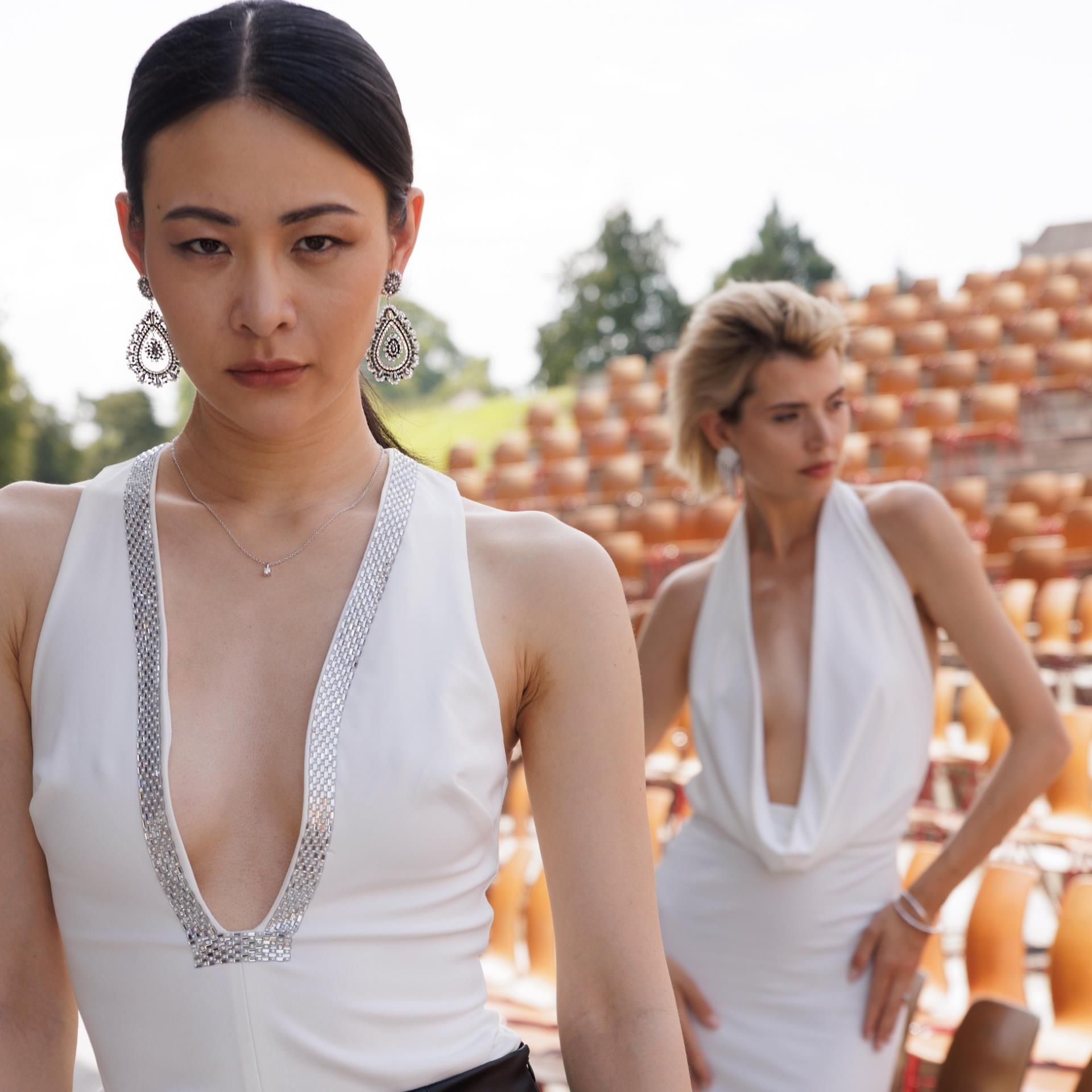 Hand-knotted boho earrings made from precious silver-coloured seed beads in a drop shape. There is a movable element in the centre of the drop, which gives the earrings a special sophistication. Super easy to wear, stud made from allergy-friendly titanium. Total length approx. 7 cm.