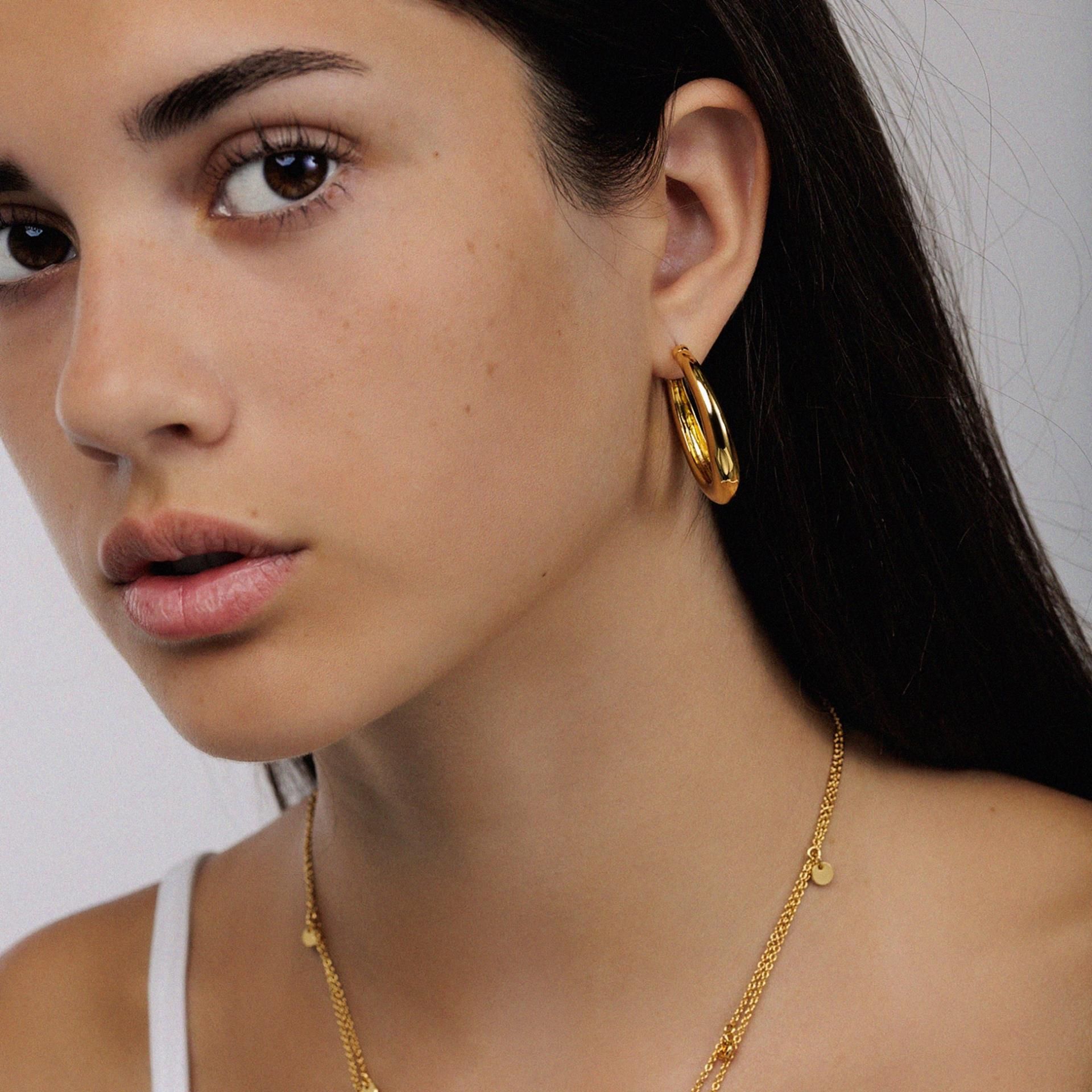 The elegant, slightly thicker gold-plated hoop earrings are the perfect accessory for any look. They are easy to combine and are a classic eye-catcher that gives your outfit that certain something. Total length: approx. 3 cm