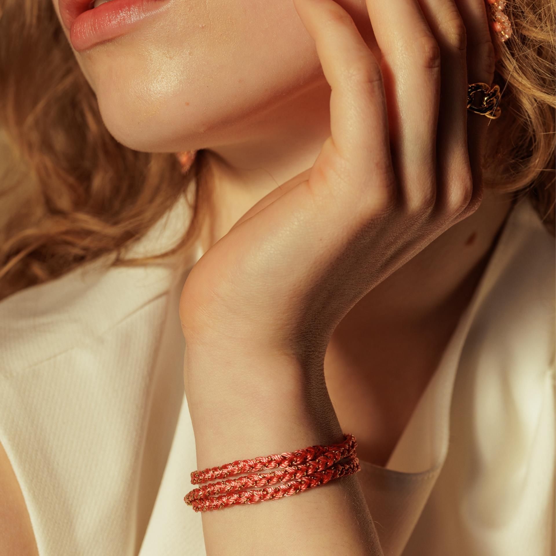 Elegant wrap bracelet made from radiant, coral-coloured fabric ribbons, artfully interwoven with elegant, 14-karat gold-plated chains. This beautiful piece of jewellery sets stylish accents and can be perfectly combined for both everyday wear and special occasions. Different colour variations available! Adjustable in size, total length approx. 46-49.5 cm.