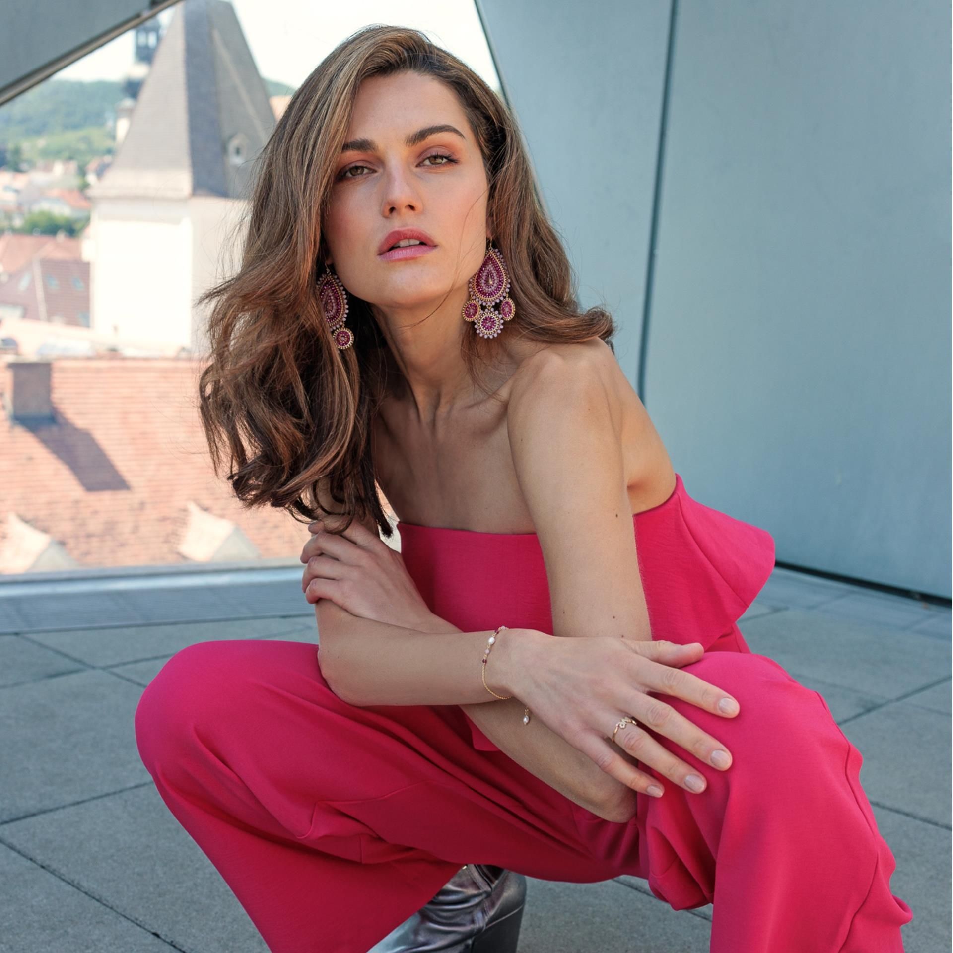 Eyecather Deluxe au look Barbie branché ! Cette magnifique boucle d'oreille nouée à la main dans des tons frais de rose et de blanc est un accroche-regard rayonnant pour toutes celles qui aiment porter de grandes boucles d'oreilles. La longueur totale des boucles d'oreilles est d'environ 8,5 cm.