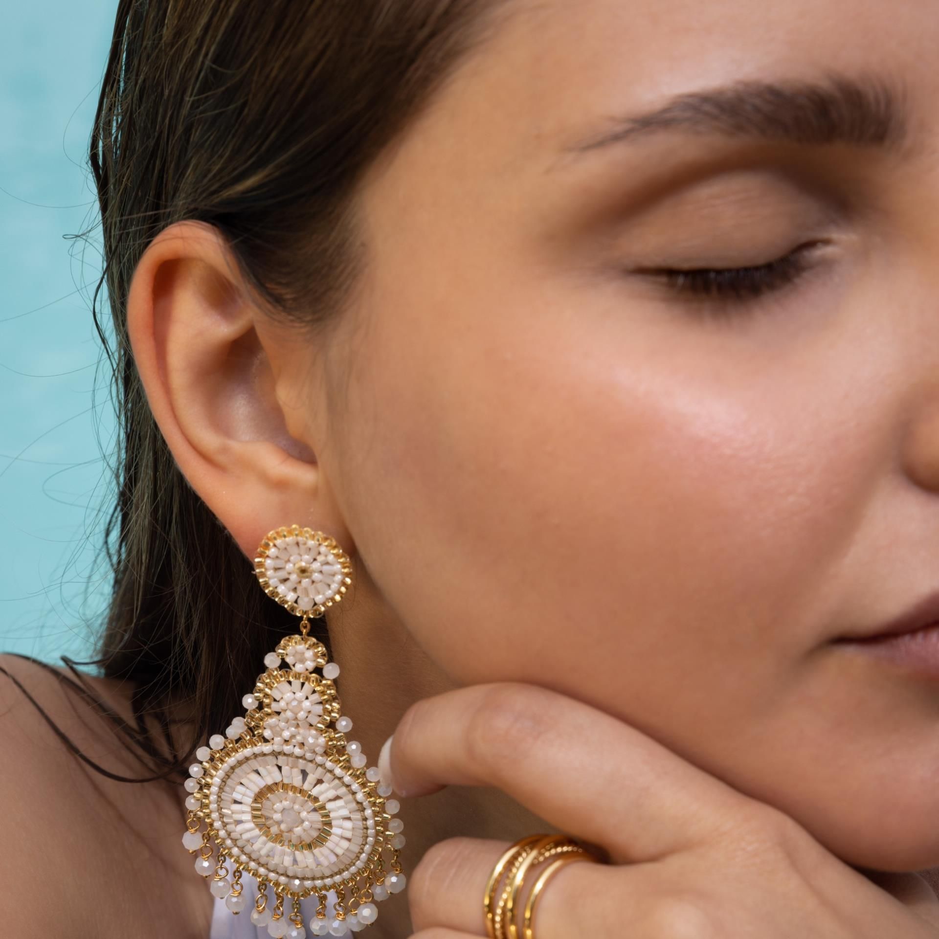Nouveau dans ! Spectaculaires boucles d'oreilles nouées à la main dans des tons blancs/or scintillants. Malgré leur taille d'environ 9,5 cm, elles sont légères et très confortables à porter grâce aux connecteurs en titane hypoallergéniques ! Notre must-have de la saison actuelle !