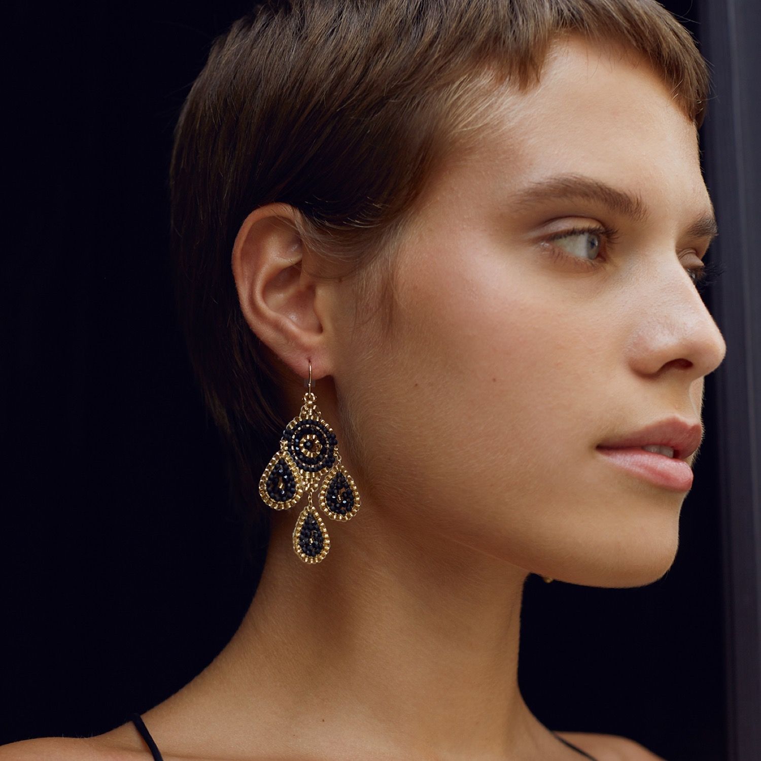 Boucles d'oreilles uniques fabriquées à la main dans des tons noirs/or attrayants ; très facile à porter, longueur totale d'environ 6,7 cm