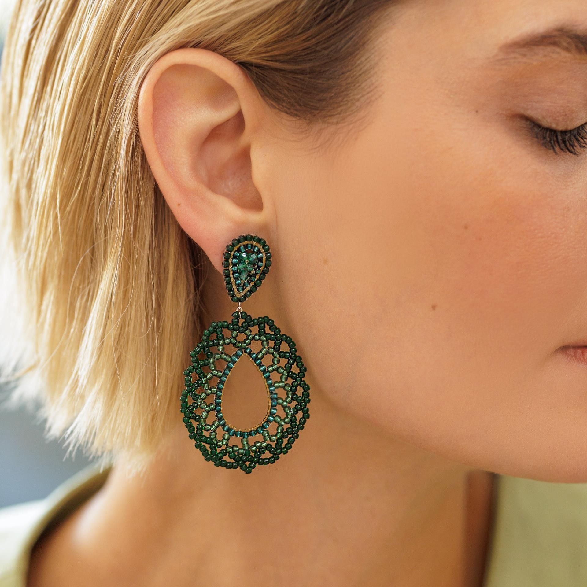 Des boucles d'oreilles boho vertes qui rappellent une dentelle délicate. Un eyecatcher discret qui se combine avec pratiquement tous les looks. Très confortables à porter grâce à leur poids léger. La longueur totale est d'environ 6,5 cm.