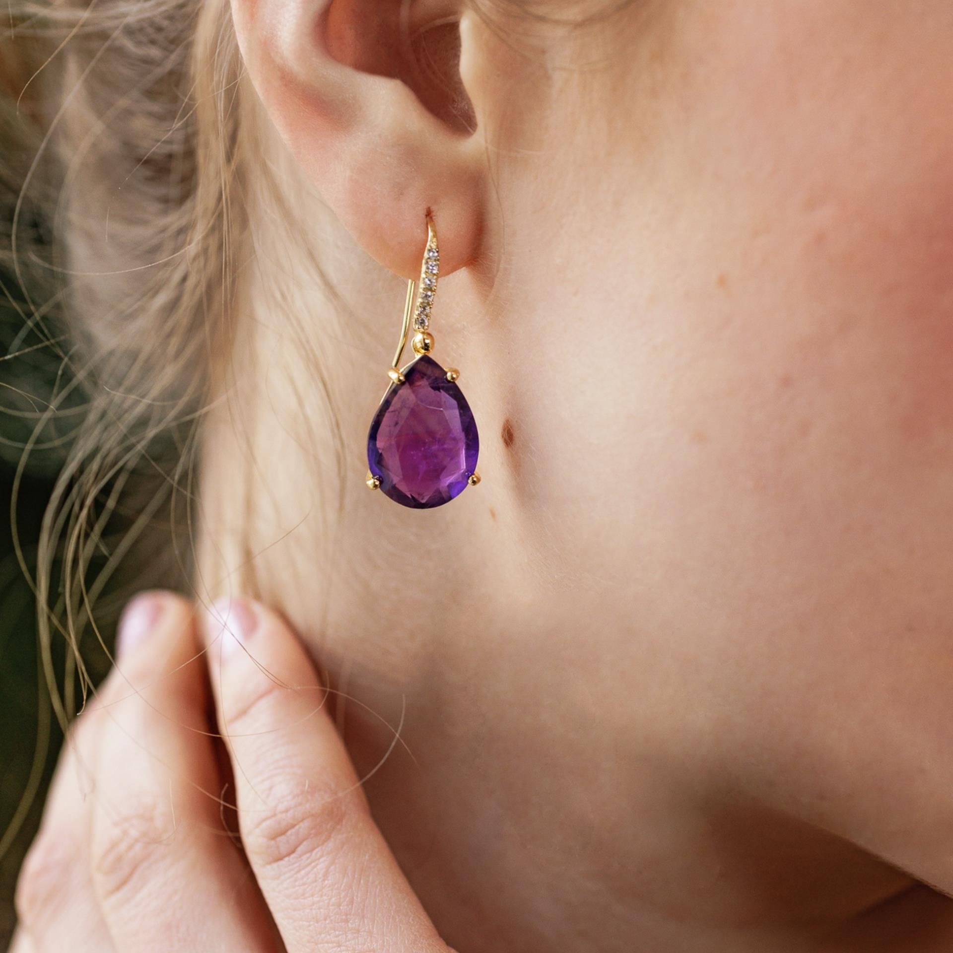 Attrayants pendants d'oreilles avec une véritable améthyste violette dans une délicate monture dorée à l'or fin 14k, sertie de cristaux. Un accroche-regard classique qui se combine avec de nombreux looks. Longueur totale d'environ 3,5 cm