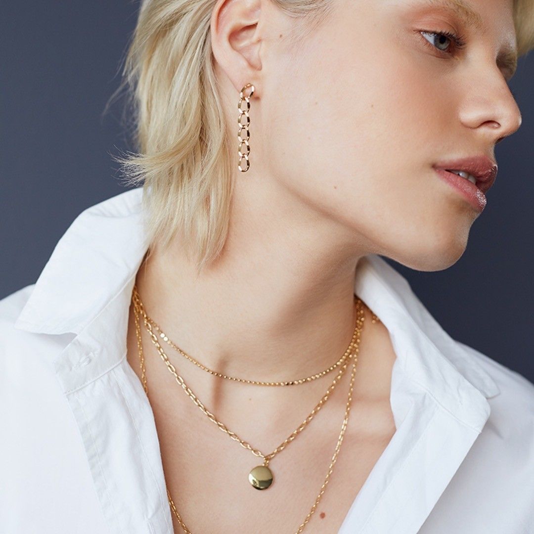 Pour une grande entrée en scène : les boucles d'oreilles en chaîne dorées scintillantes sont de véritables accroche-regards et apportent une touche particulière !