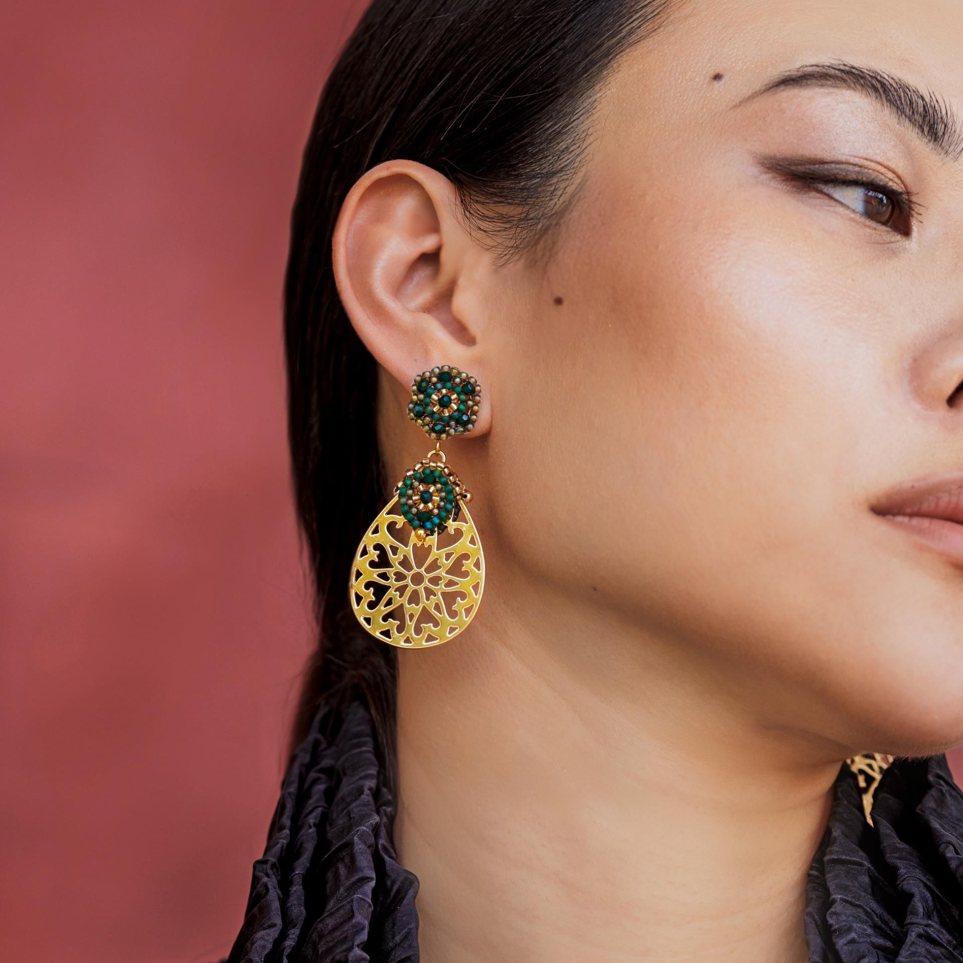 Un accroche-regard ! Ces boucles d'oreilles ornementales dorées avec un petit élément boho vert sont légères comme une plume et agréables à porter. Un superbe complément à chaque tenue ! Longueur totale d'environ 6,5 cm.