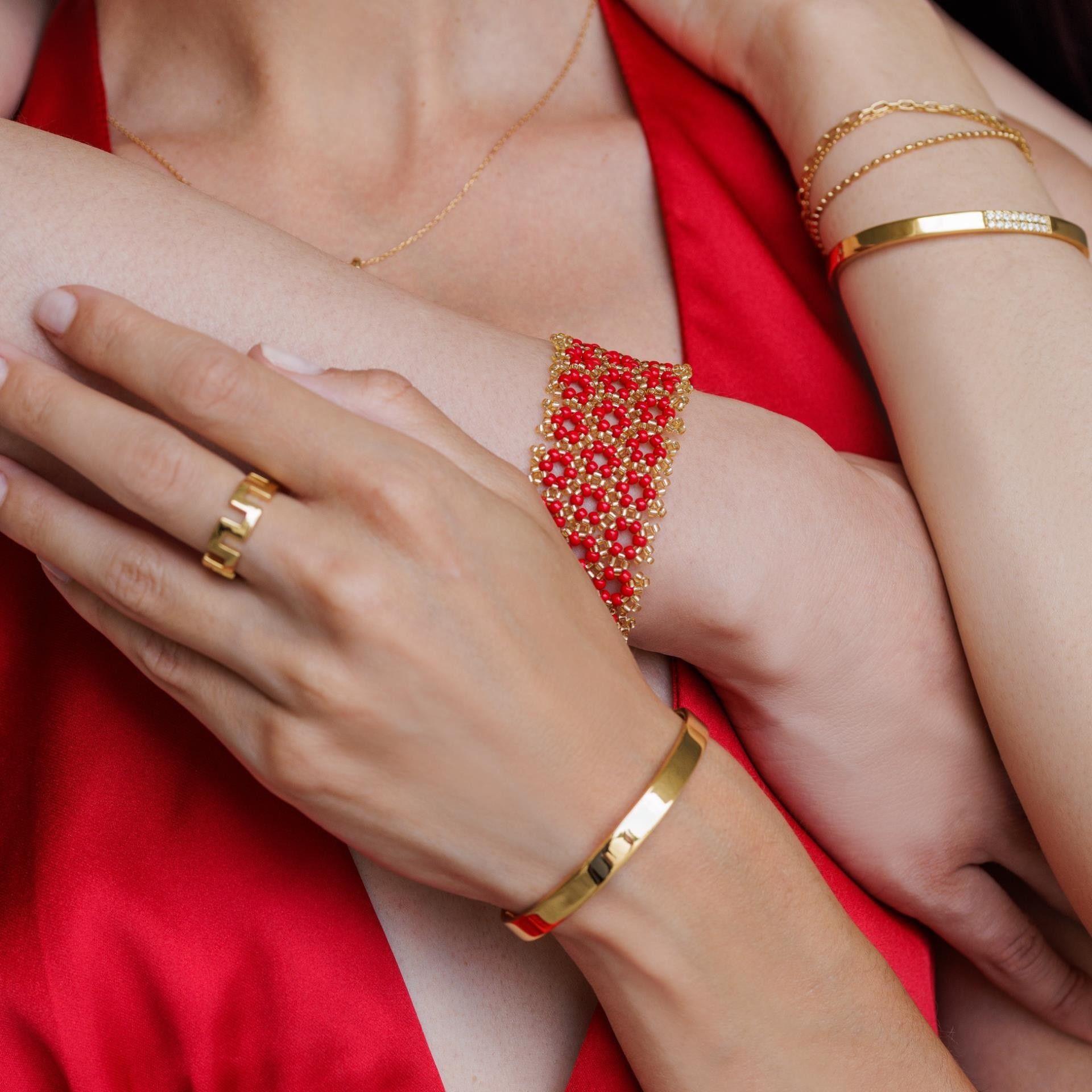 Quelque chose de très particulier - le nouveau bracelet noué à la main de CAJOY dans les couleurs rouge/or. Le bracelet s'adapte agréablement à votre poignet et attirera tous les regards. Grâce à la petite chaîne près du fermoir, la longueur peut être réglée individuellement.La largeur du bracelet est d'environ 3 cm.