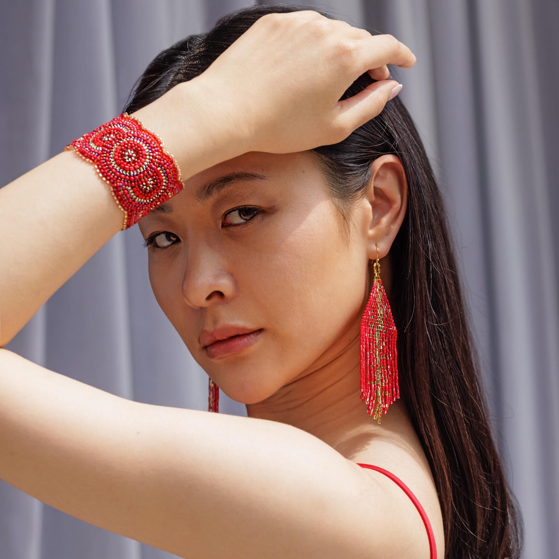 Quelque chose de très particulier - le nouveau bracelet noué à la main de CAJOY dans les couleurs rouge/or. Le bracelet s'adapte agréablement à votre poignet et attirera tous les regards. Grâce à la petite chaîne près du fermoir, la longueur peut être rallongée individuellement jusqu'à 3 cm. La longueur de la partie ornée de perles est d'environ 14cm, la largeur du bracelet est d'environ 4,5 cm.