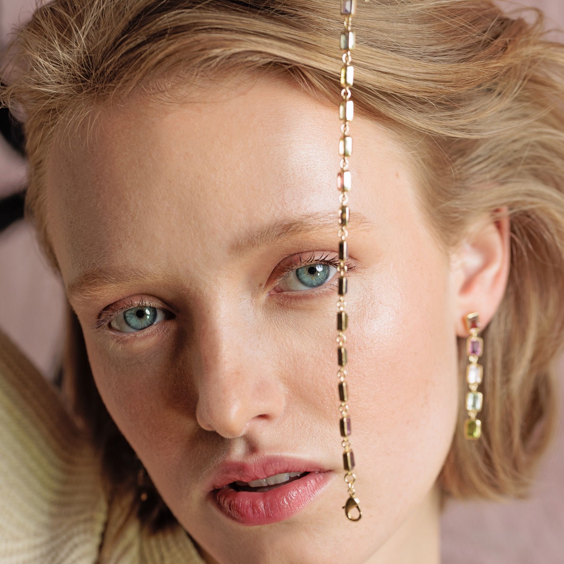 Ce bracelet doré se distingue par sa magnifique combinaison de pierres (améthyste, tourmaline rose hydro, morganite hydro, améthyste verte, péridot). L'accroche-regard de luxe ! Des boucles d'oreilles exactement assorties sont disponibles.