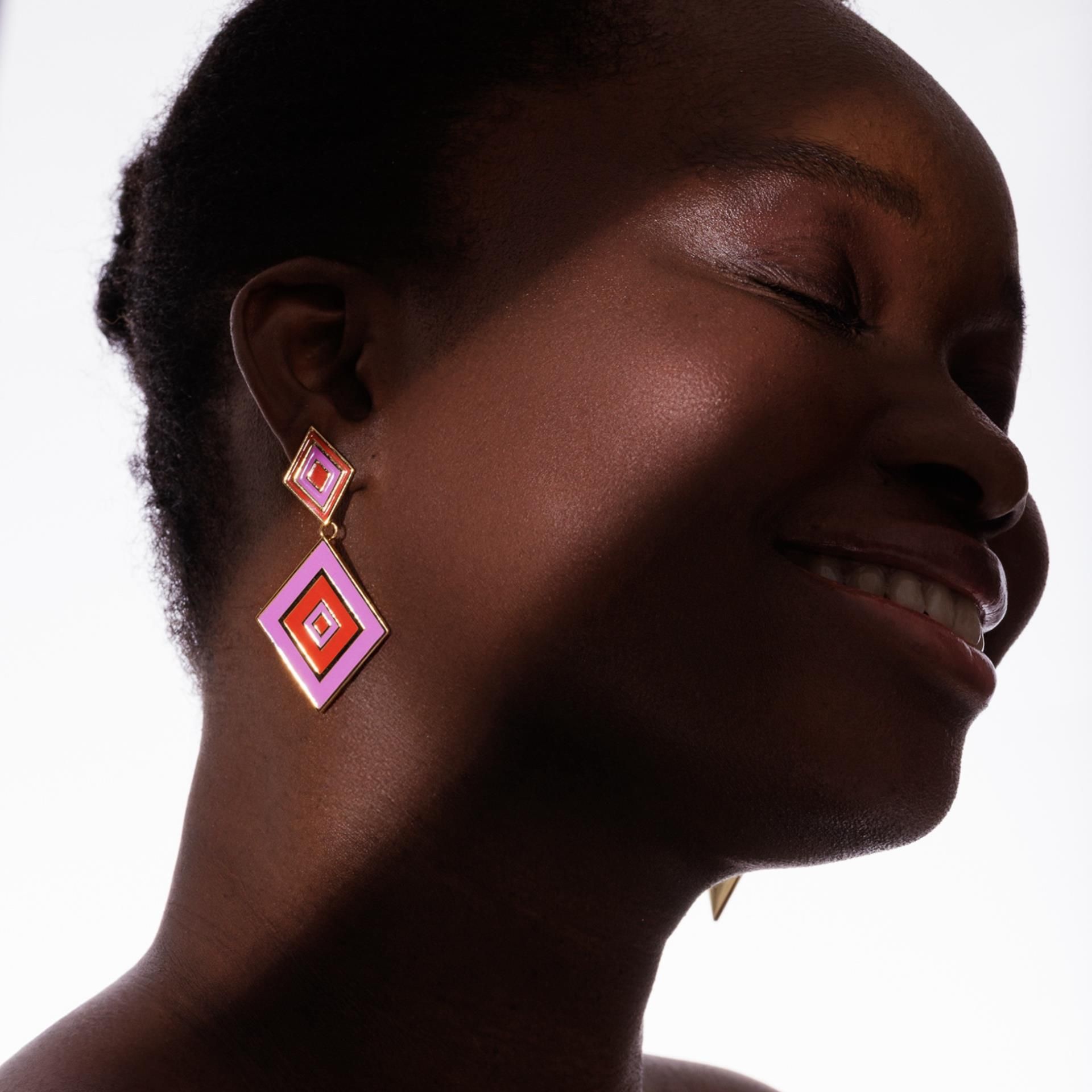 Ces magnifiques boucles d'oreilles dorées sont émaillées de rose et de rouge. Un design extravagant, à la fois rétro et moderne. Longueur totale d'environ 5,8 cm.