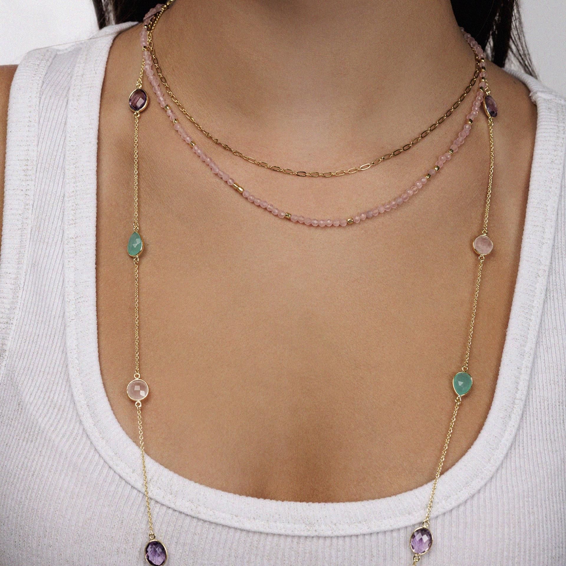 Gracieux et élégant, ce collier Aqua Hydro associe deux véritables pierres précieuses : l'améthyste et le quartz rose. Ce bijou de haute qualité plaqué or 14k apporte une touche d'élégance glamour à tous les looks. Que ce soit au bureau ou à une fête, avec ce collier, vous faites toujours le bon choix et vous vous mettez en scène avec style. Taille réglable, longueur totale env. 83-86 cm.