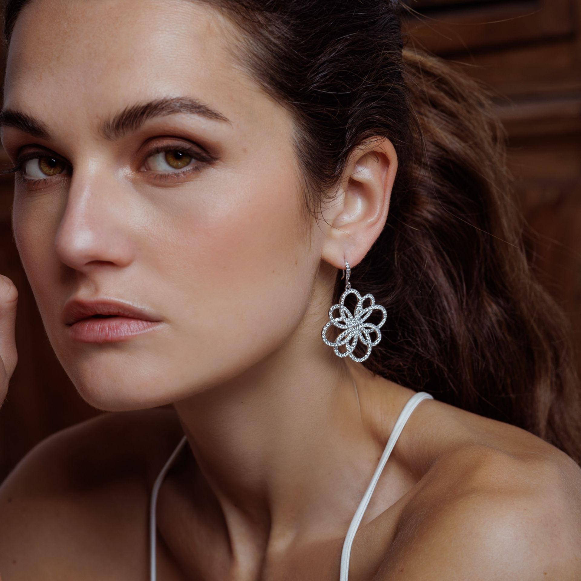 Sie lieben aussergewöhnliche Schmuckstücke mit kunstvoller Designer-Note? Dann lassen Sie sich von diesen Ohrringen aus feinem Rhodium umgarnen und verführen: Die Schönheiten sind im Blütendesign veredelt. Nicht weniger als 274 Kristalle funkeln hier um die Wette! Das hat Stil und Klasse!Gesamtlänge: 5 cm Durchmesser der Blüte: 3,5 cm