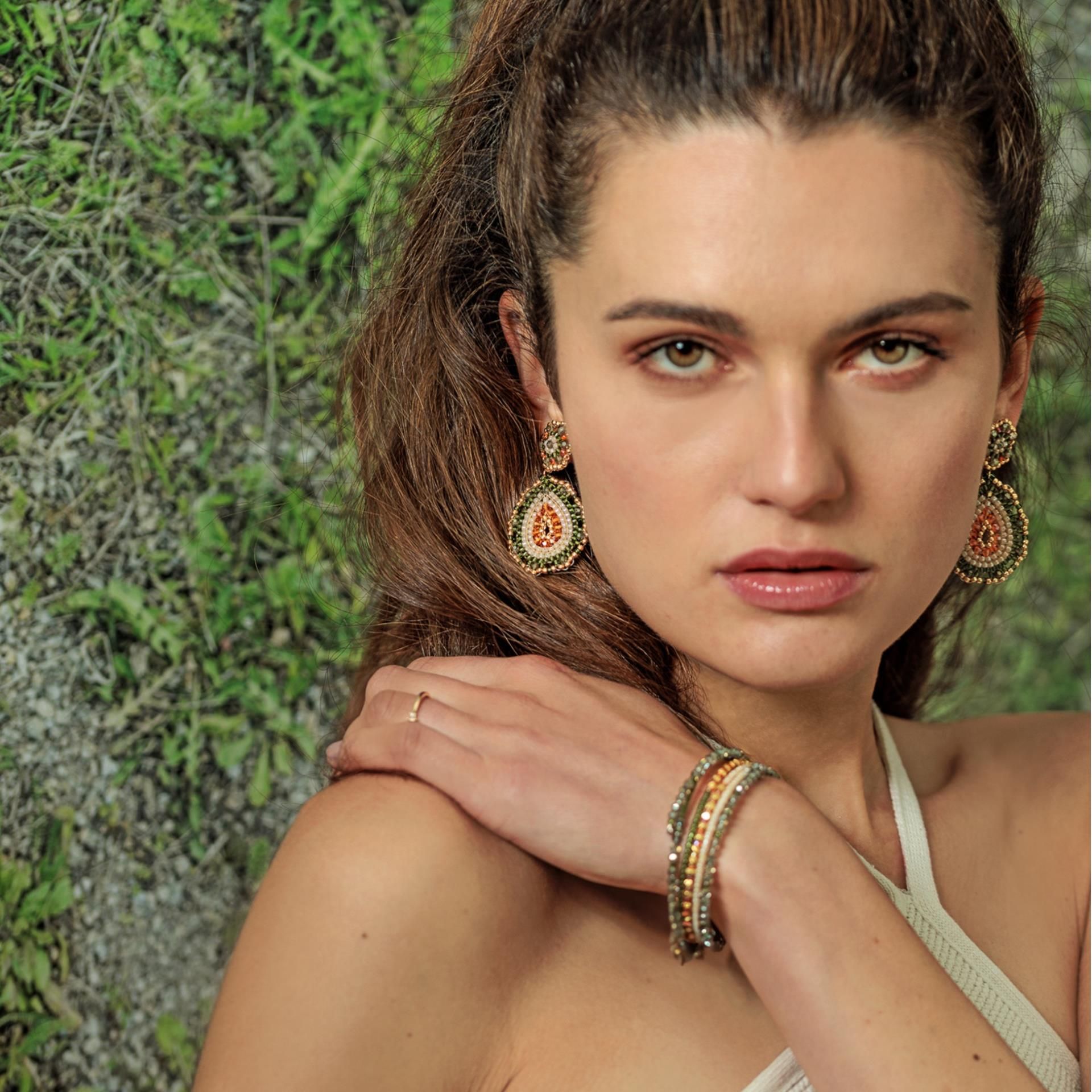 Bracelet étroit enroulé de perles Seed vertes, grises, dorées et subtilement oranges.