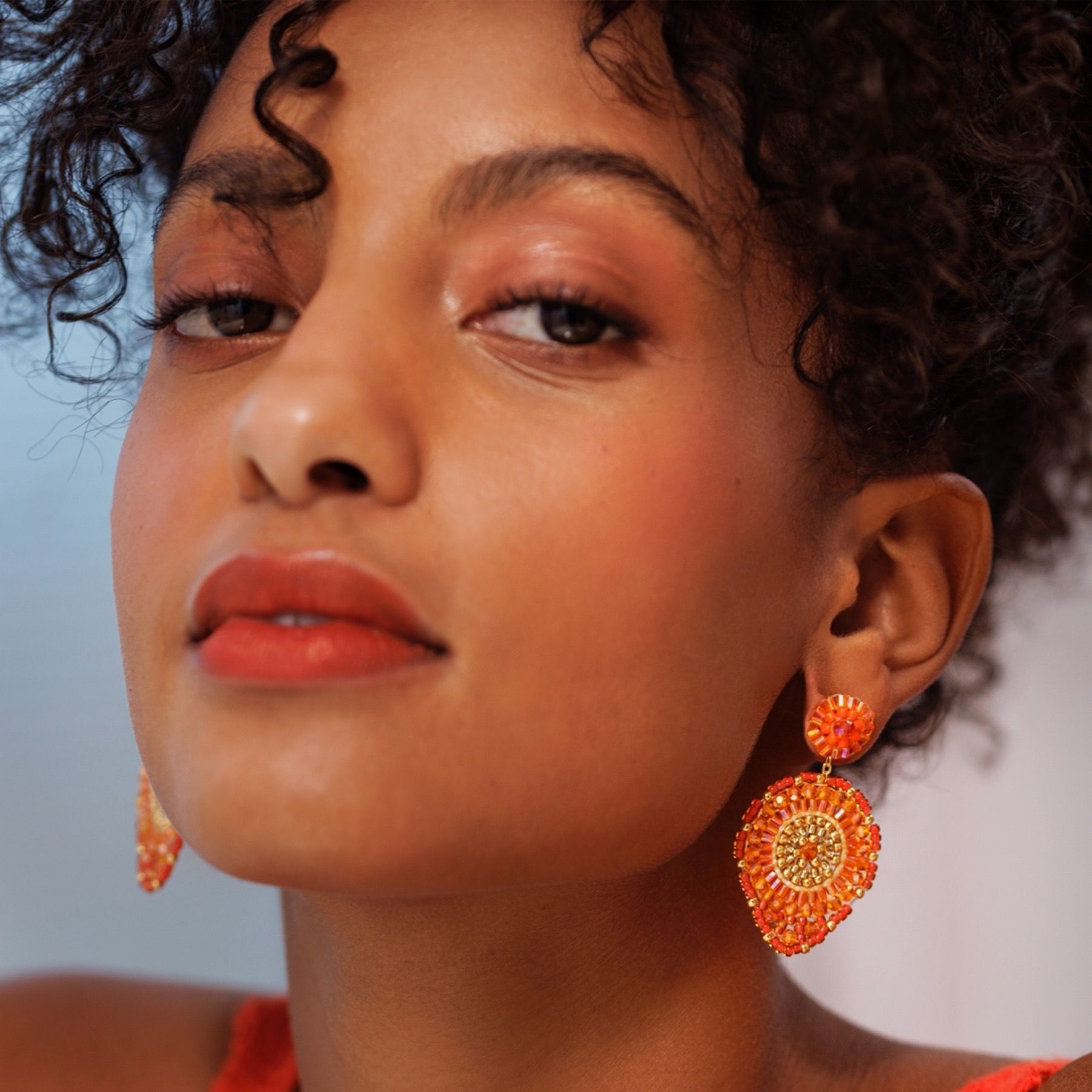 Boucles d'oreilles boho faites à la main en perles de culture orange et or. Les boucles d'oreilles ont une longueur totale de 5 cm et un clou d'oreille en titane qui convient spécialement aux personnes allergiques.