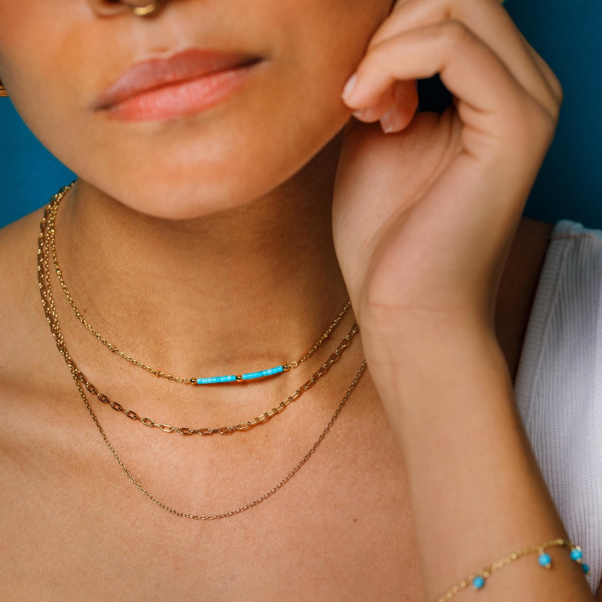Summerfeeling! Die vergoldete Kette mit türkisen Steinen ergänzt jedes Sommer-Outfit perfekt.