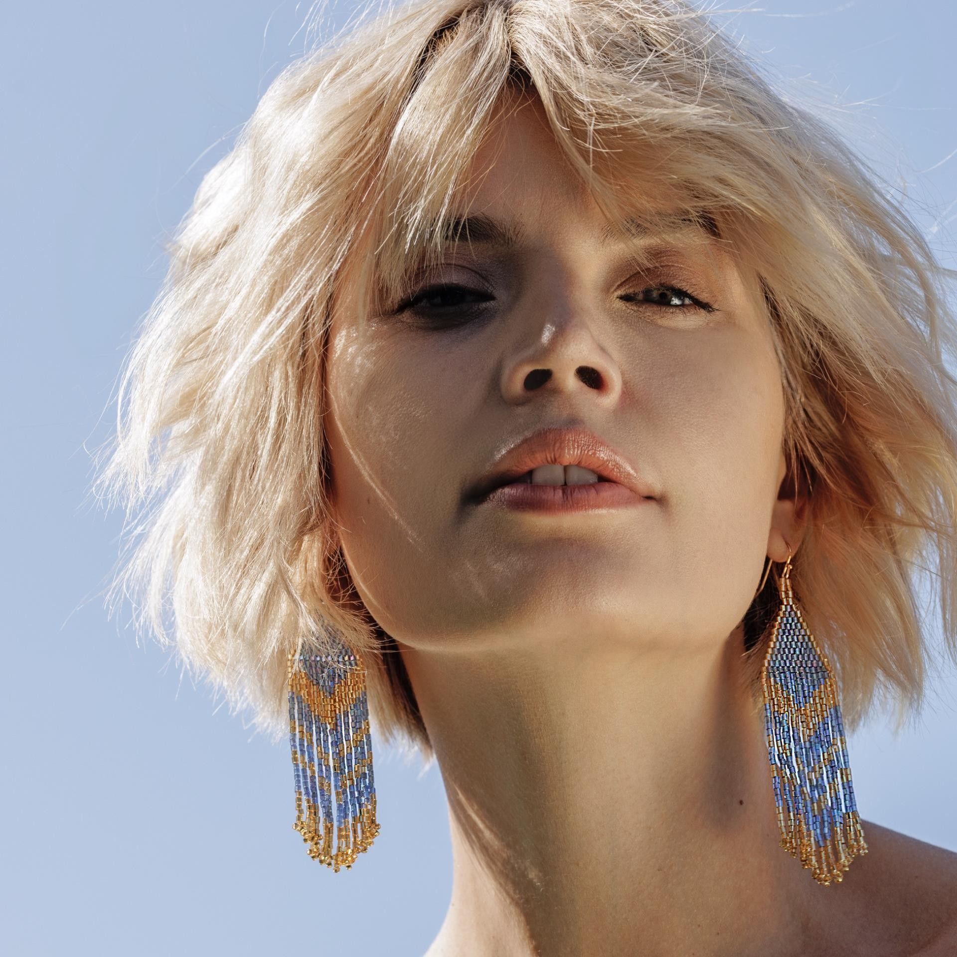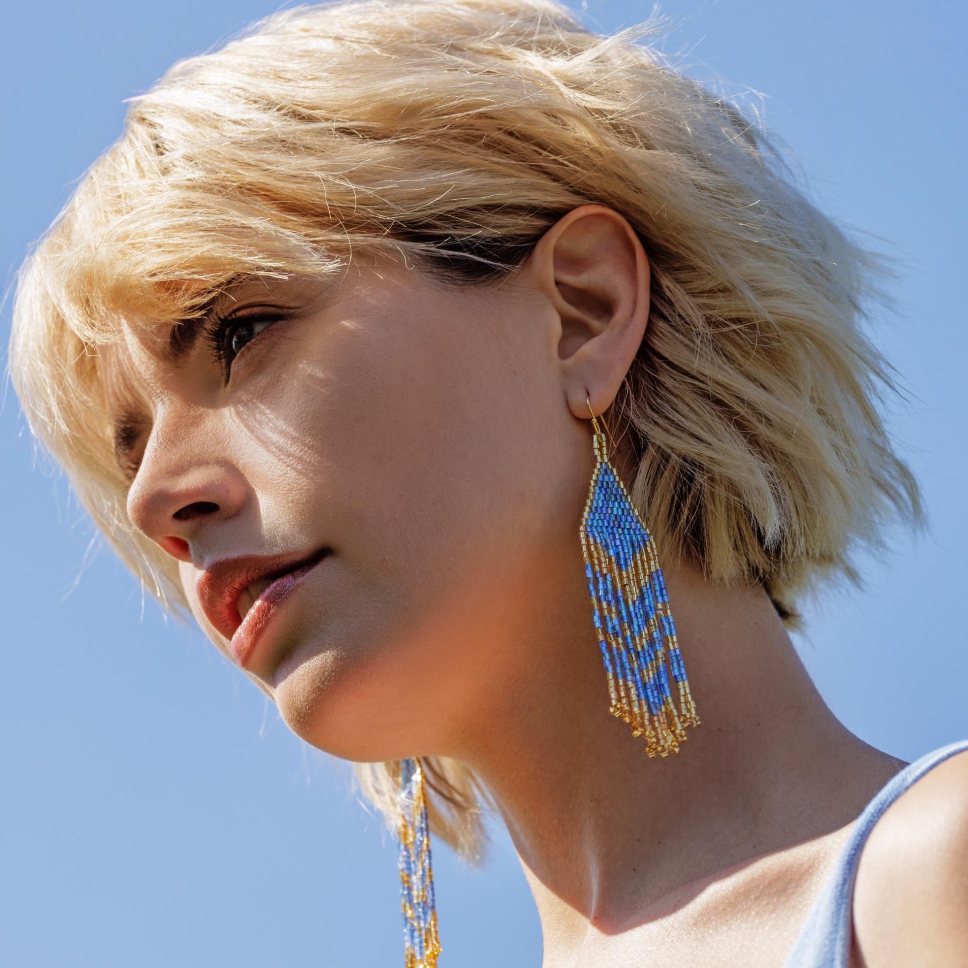 Il prossimo ballo può arrivare! I nostri bellissimi orecchini Blue Sky fatti a mano con perle di vetro azzurro e oro sono il pezzo IT della stagione e attireranno sicuramente l'attenzione di tutti. Facilissimi da indossare. Lunghezza totale circa 10,5 cm; larghezza 2,2 cm.