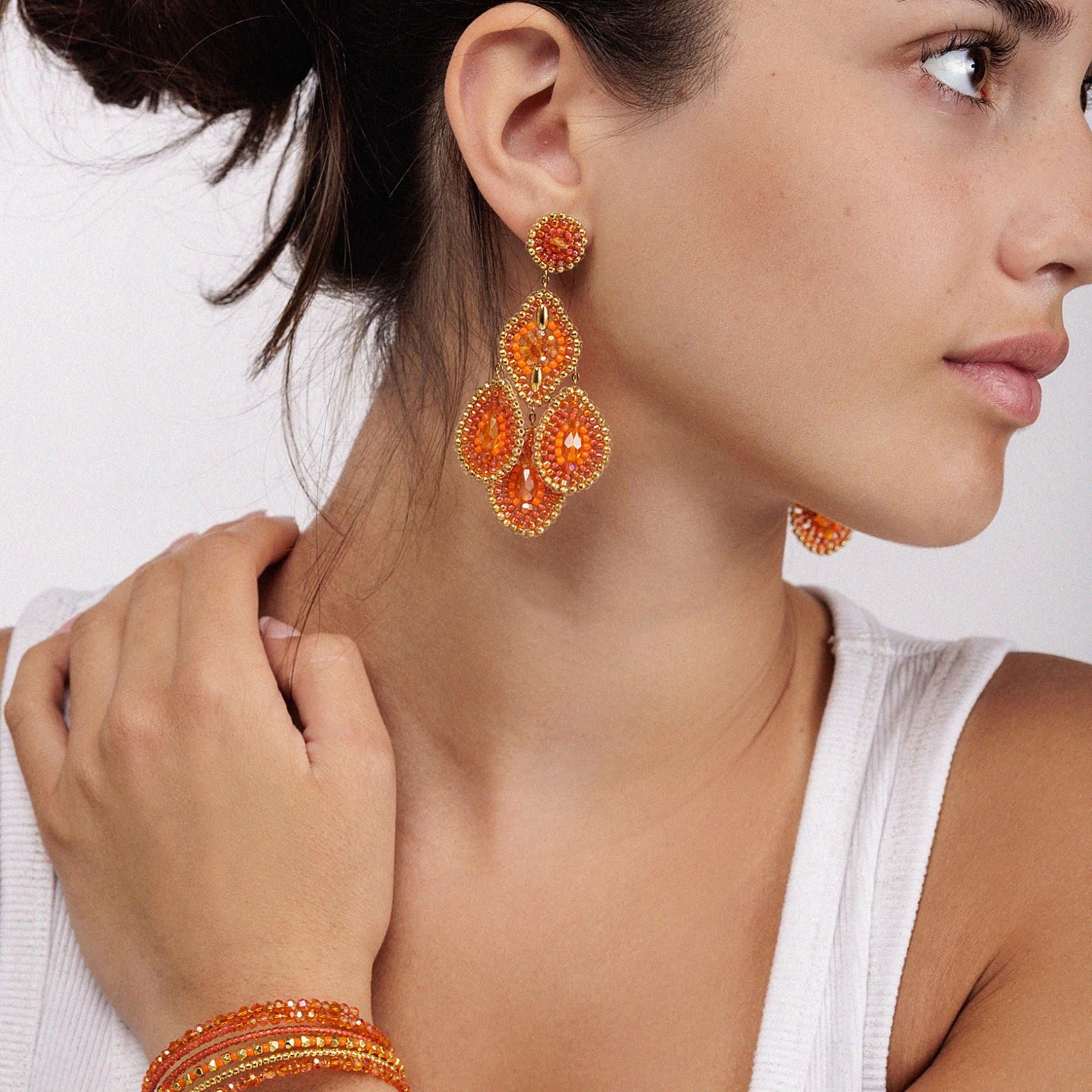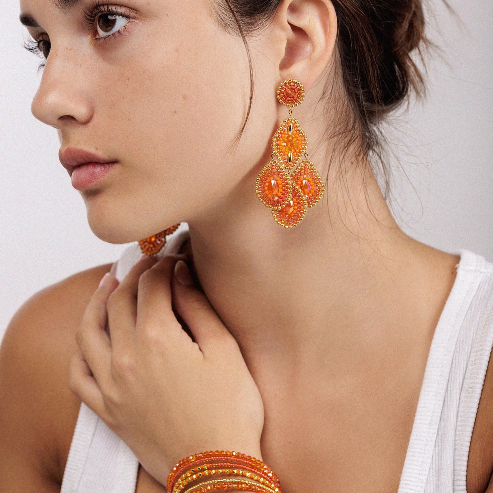 Bellissimo orecchino fatto a mano di un vivace colore arancione con 3 pendenti mobili. Il perno dell'orecchio è realizzato in titanio ed è quindi estremamente adatto alle allergie. Lunghezza totale dell'orecchino circa 7,5 cm.